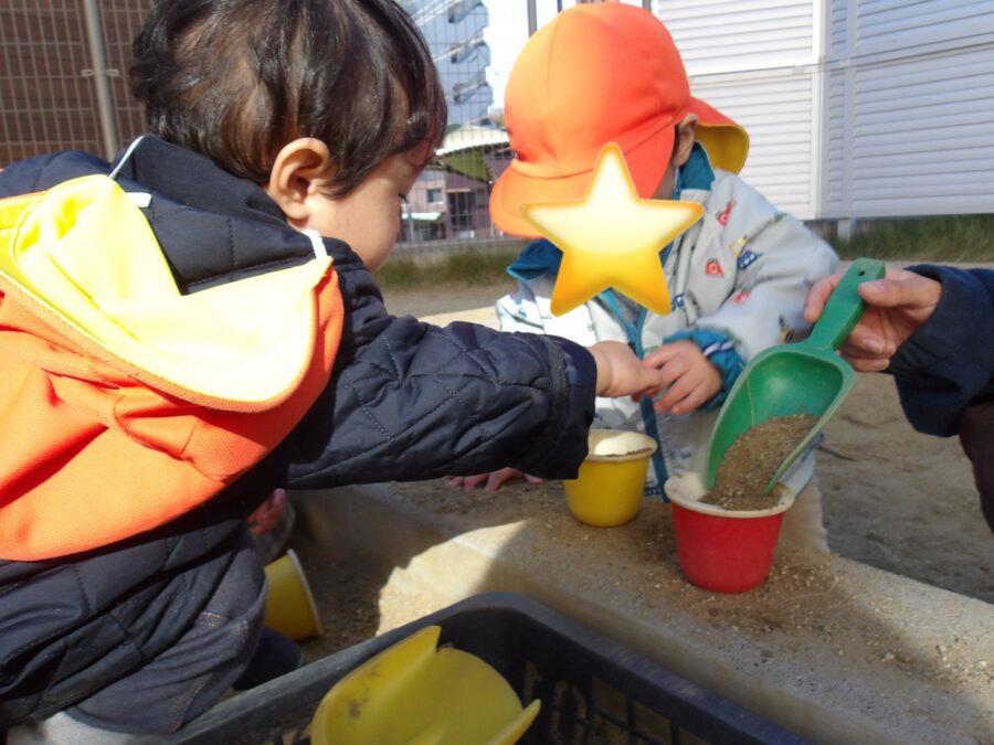 カップにお友だちと砂を入れて、ケーキを作っていましたよ🎂