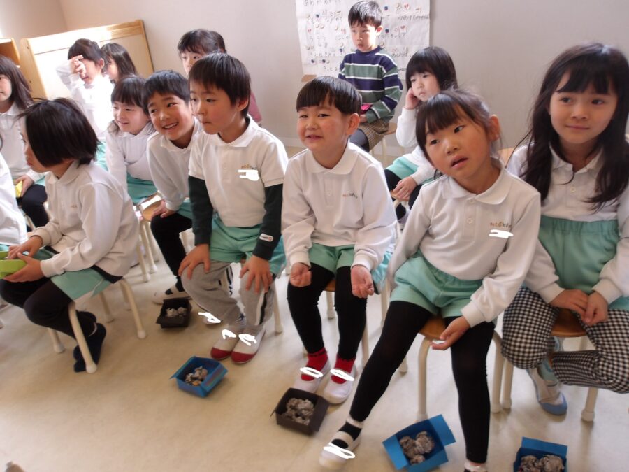 そら組、にじ組、たいよう組は自分で三方を折って豆の入れ物を作りました!