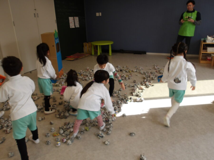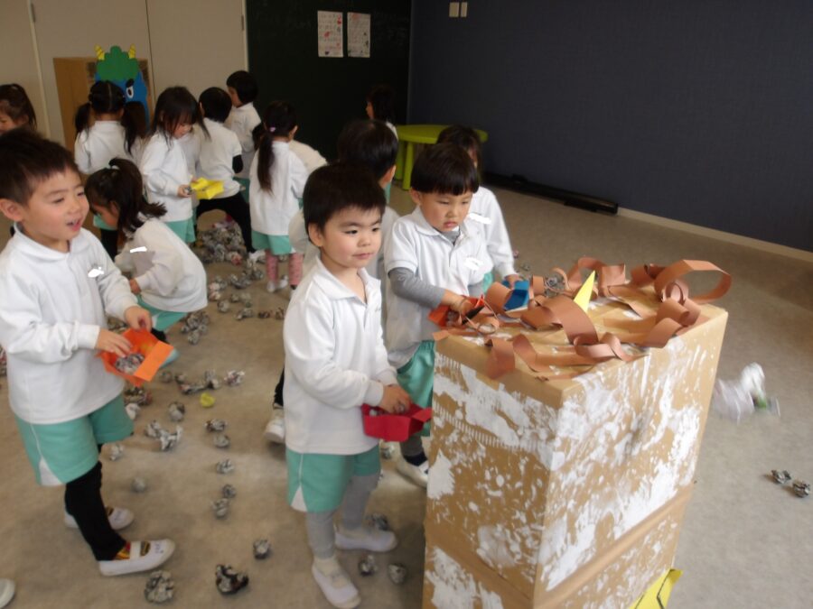 泣き虫おに、怒りん坊おに、いたずらおに…ちょっぴり難しいお話ですが、そんな心にいる鬼をみんなでやっつけよう!というお話でした。