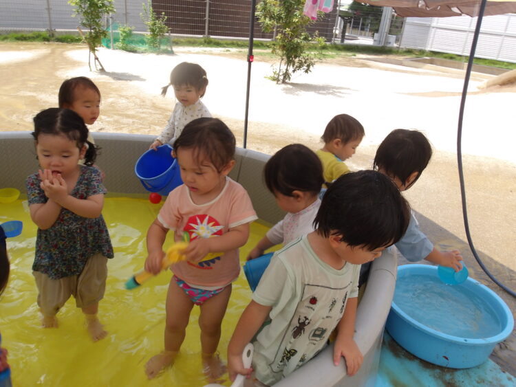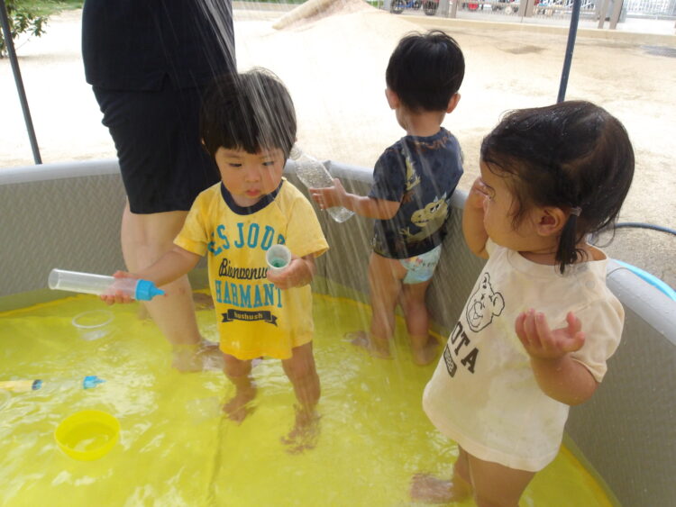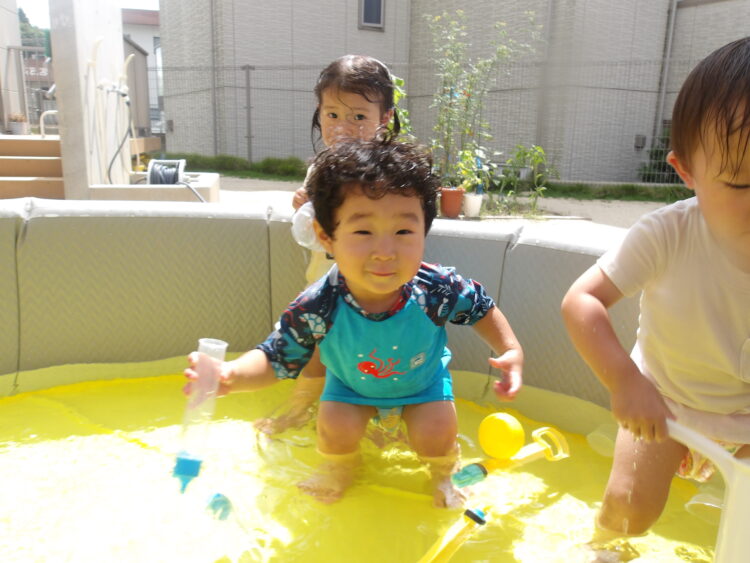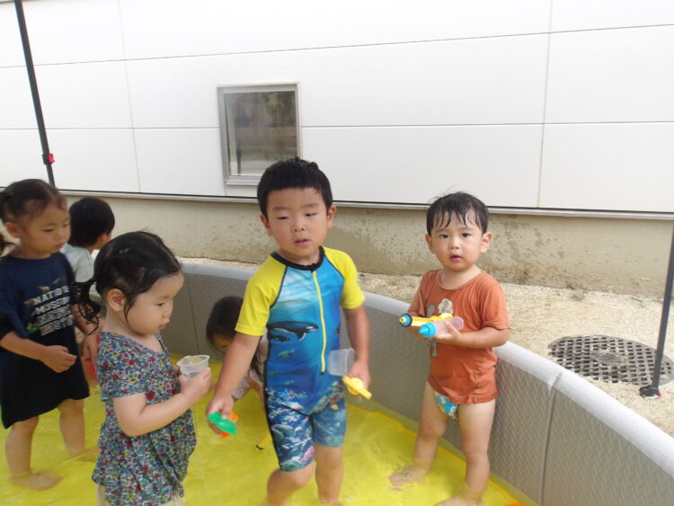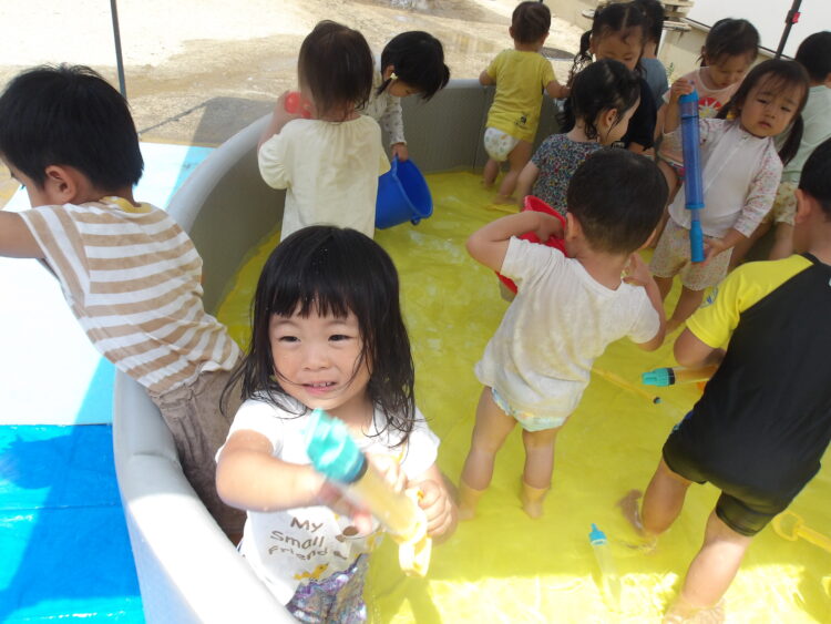 水鉄砲やバケツを持って小窓や外に水を流したり、先生とかけあいっこをする姿が見られました🥰