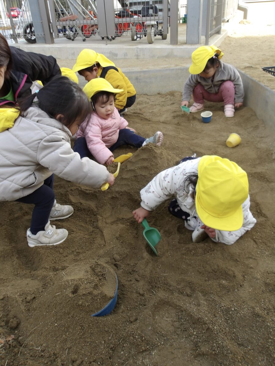 今日はお外に出るとすぐにお砂場で保育士と一緒にお砂のお山を作っていました![]()
