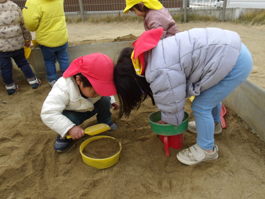 お砂場でうさぎ組さんは自分たちなりの色んな遊びをしていましたよ!