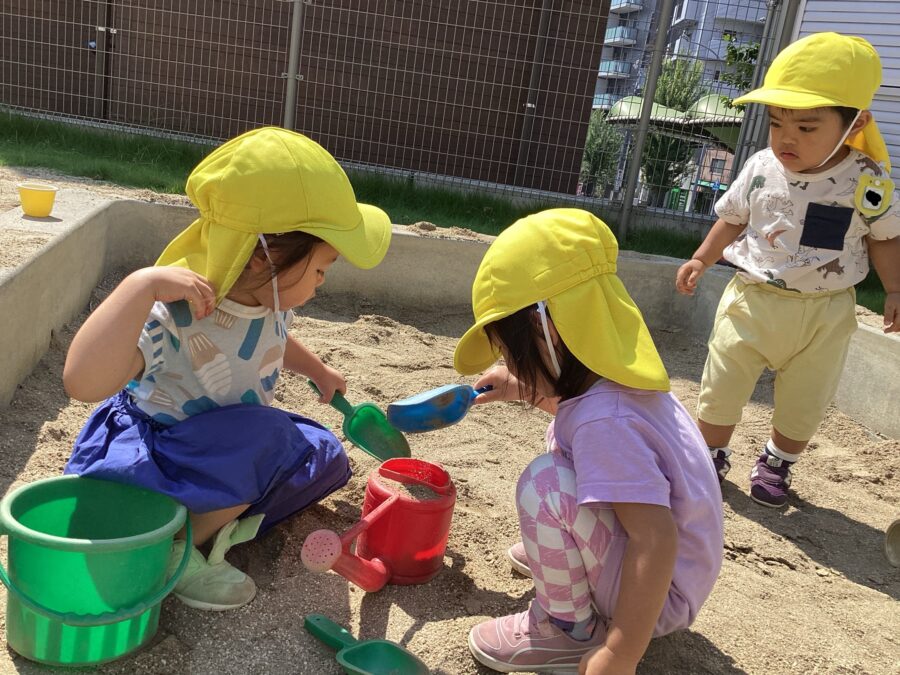 お友だちとお話ししながら砂遊びも楽しいね