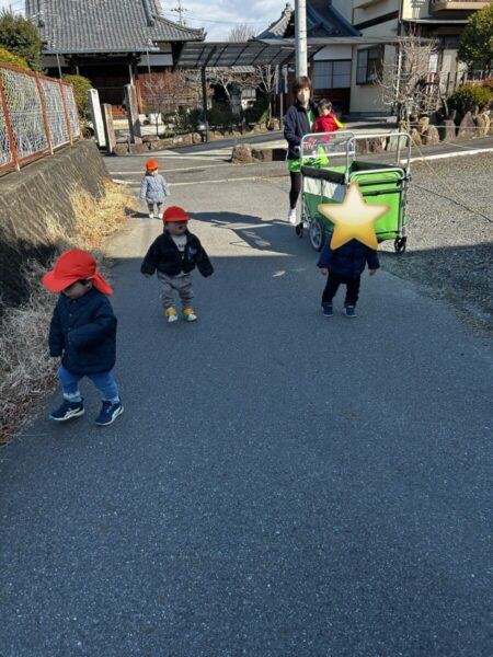 お地蔵さんに「こんにちは」とあいさつしたり、今日はわんちゃんの鳴き声はしなかったけど、いるかなー?とじーっと見ていましたよ![]()
