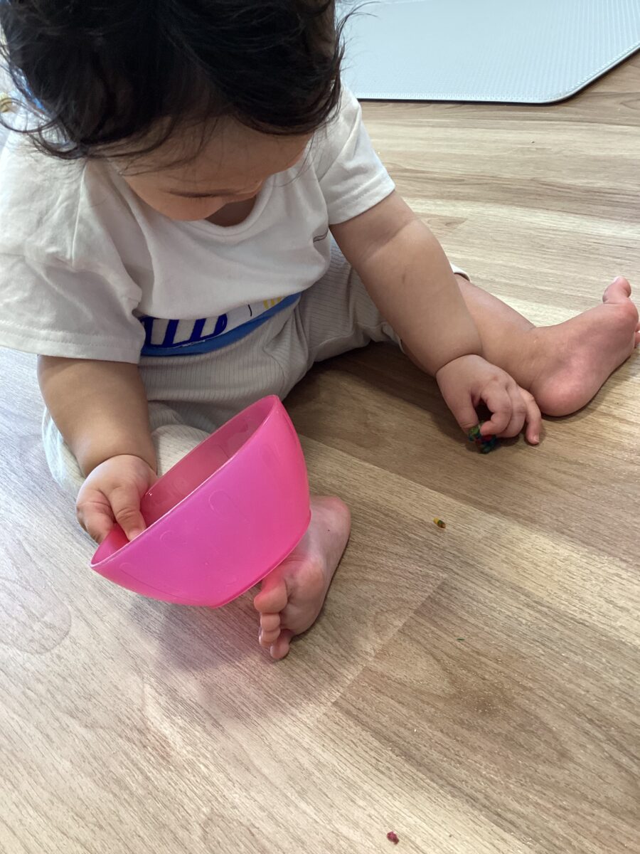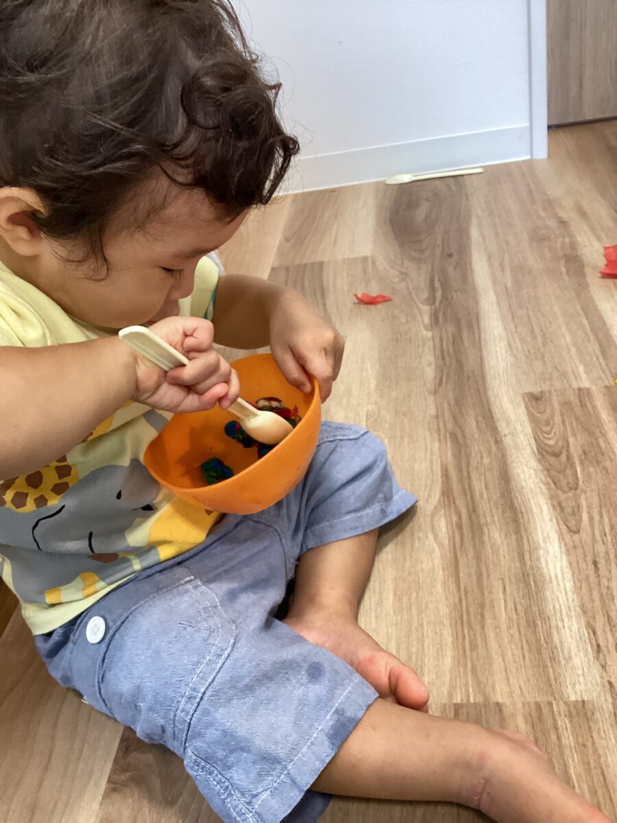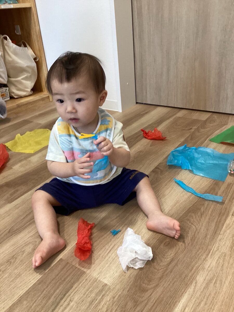 手先を器用に使ってお花紙をビリビリちぎったり、ぐしゃぐしゃに丸めた後は、、