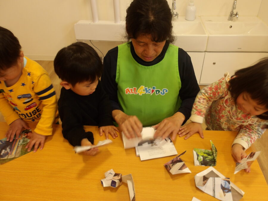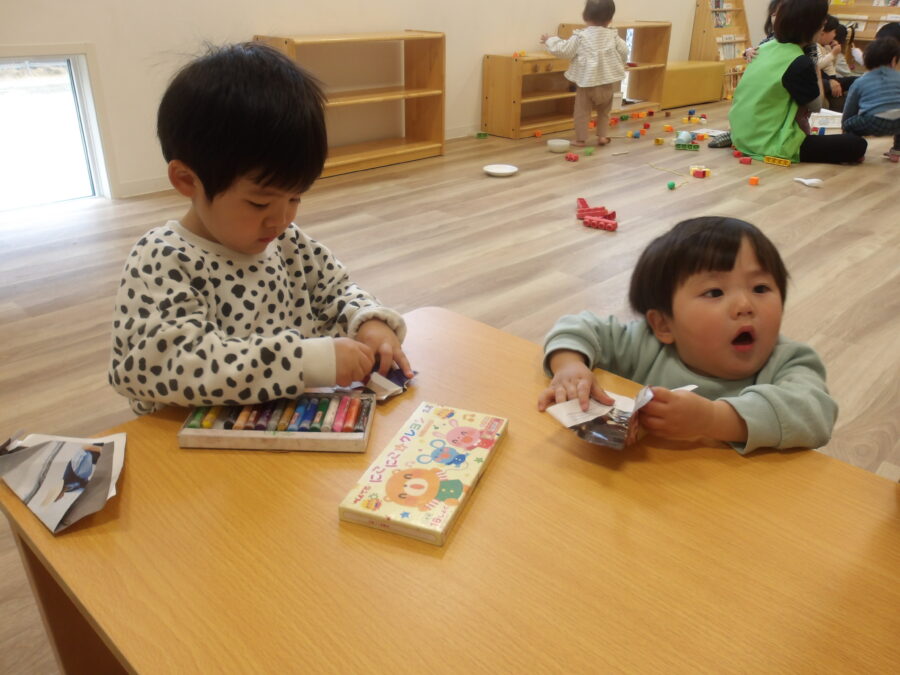 うさぎ組のお友達は保育士と一緒に折り紙をしたり、その紙にクレヨンで🖍️お絵描きをしている子もいました!!