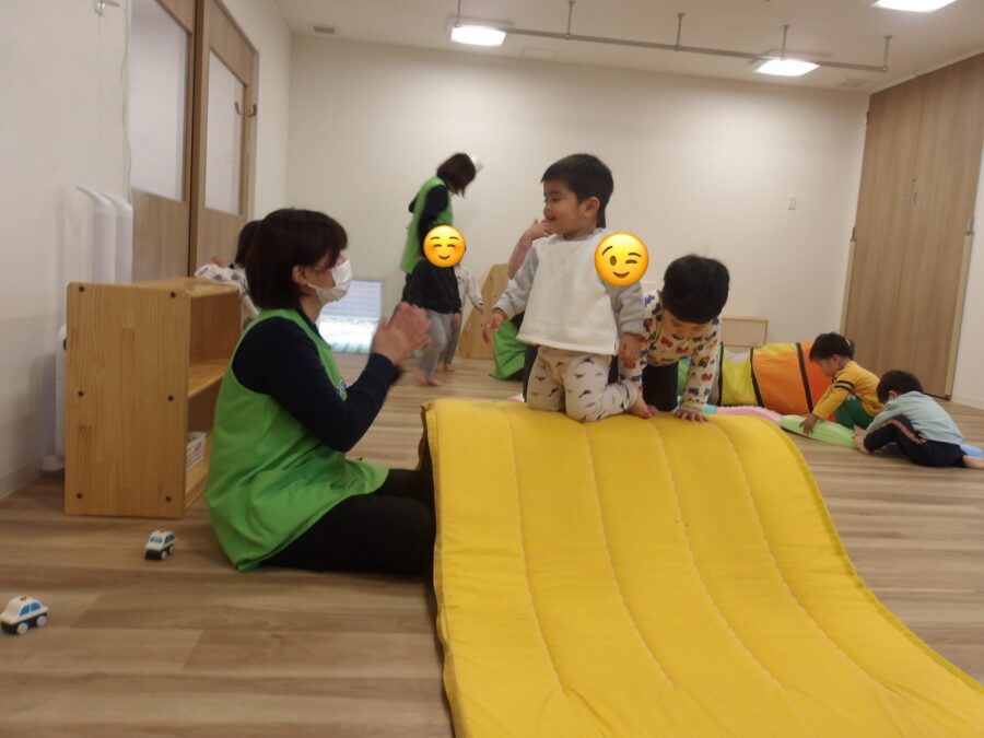 準備をしている途中でも、絵本を見ていたあひるさんうさぎさんはワクワク楽しみが気持ちが溢れ、早くしたーいといった様子で集まってきており、いざ始まると、並ばないといけない時は自分達で1列にしっかり並び、保育士の手を使いつつ自分でしたい!といったように自分でできる時には自分の手で進んだり、滑ったりを楽しんだ1日でした❕