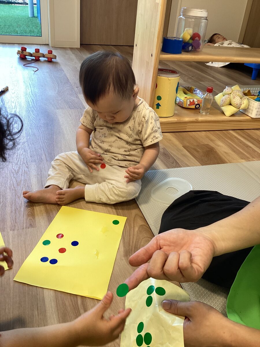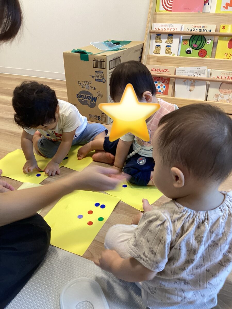 おててにくっつくのを不思議そうに見つめるお友だち、指に つけたり,外したりを楽しんでるお友だち、集中してシールを何枚も貼っているお友だち。それぞれが楽しんでいましたよ![]()