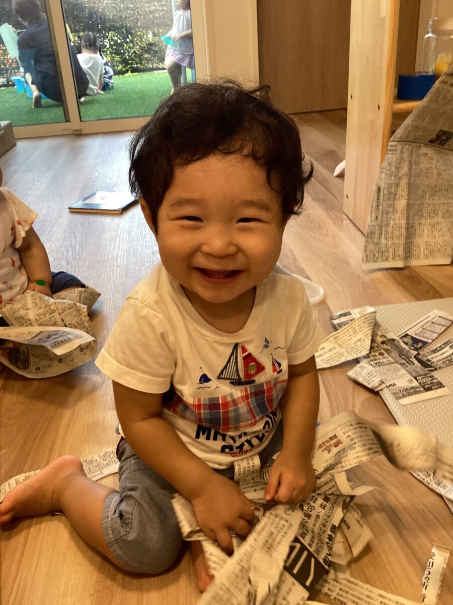 新聞をビリビリした後は、ビニール袋に入れて,ボールにして遊びました![]()