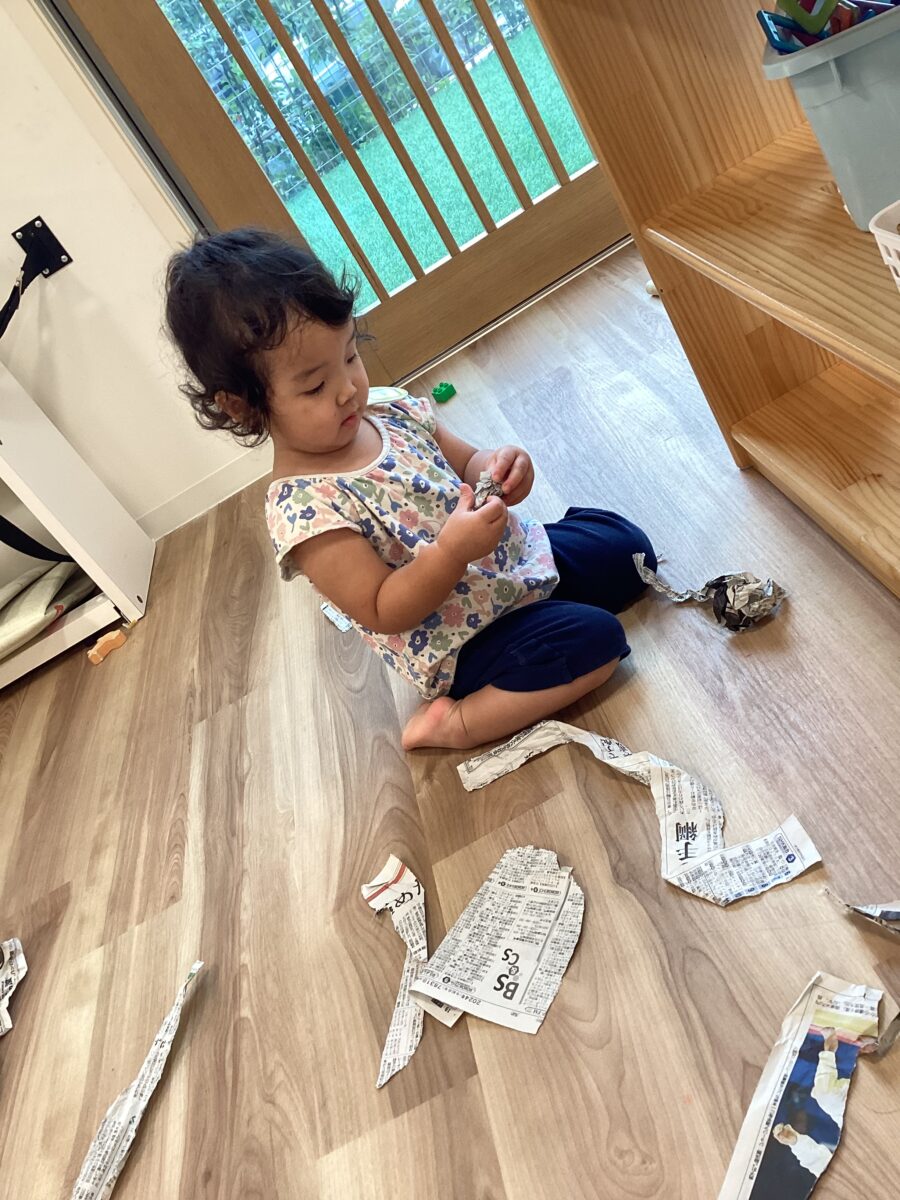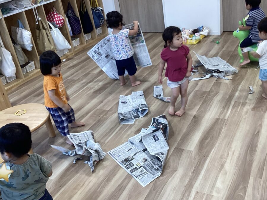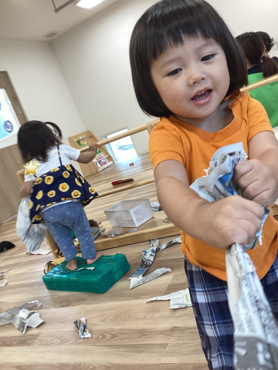 自分の思うようにビリビリと破ったり、雪のようにふわふわ〜としたり、鬼だぞ〜!という声に「うわ〜!!」と逃げながらニコニコ爆笑していましたよ〜![]()