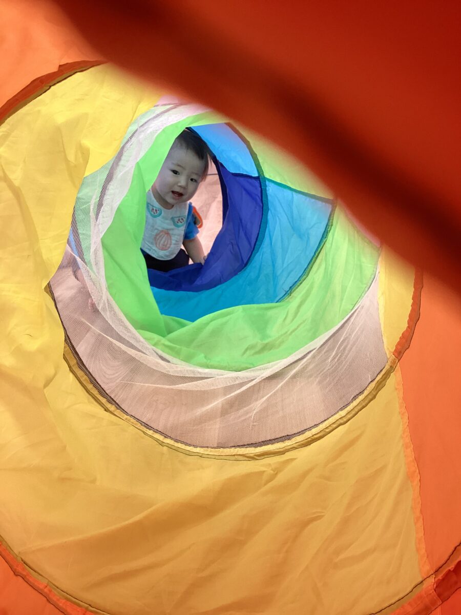 保育士がトンネルの端から覗くと、「ばあー!」と言ってニコニコ笑顔でハイハイできてくれました![]()