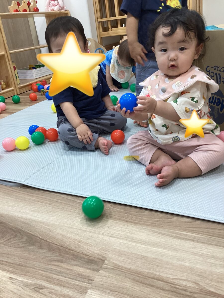 ボール遊びでは、ダンボールの箱に入れたり、コロコロ転がすと、ハイハイで急いで取りに行ったりしていましたよ![]()