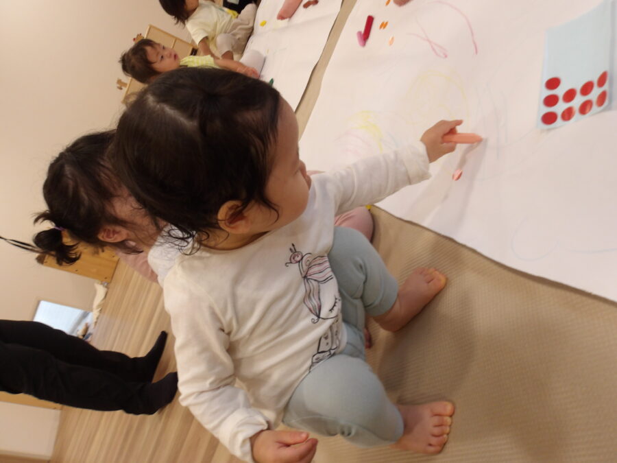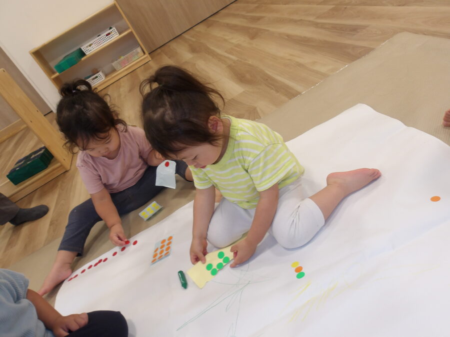 あひる組さんは、お部屋で大きな画用紙にシールを貼ったり、クレヨンでお絵描きをしました!