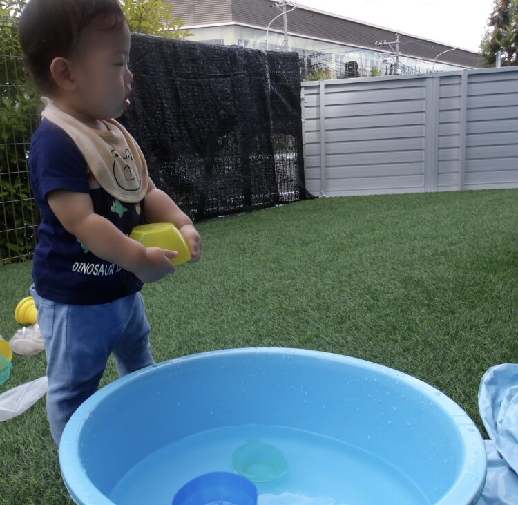 カップやバケツなどの入れ物に水を汲んでひっくり返すと水が落ちてくるのが楽しくて皆んな一生懸命に水をすくっています!
