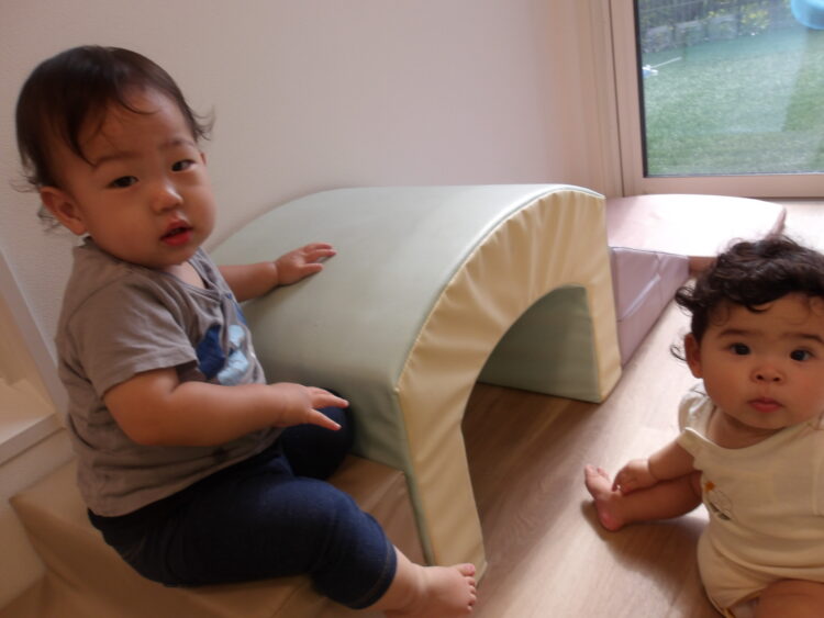 つかまりたちができるようになりテラスで遊んでいる子の方を見ています