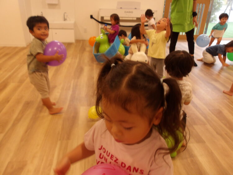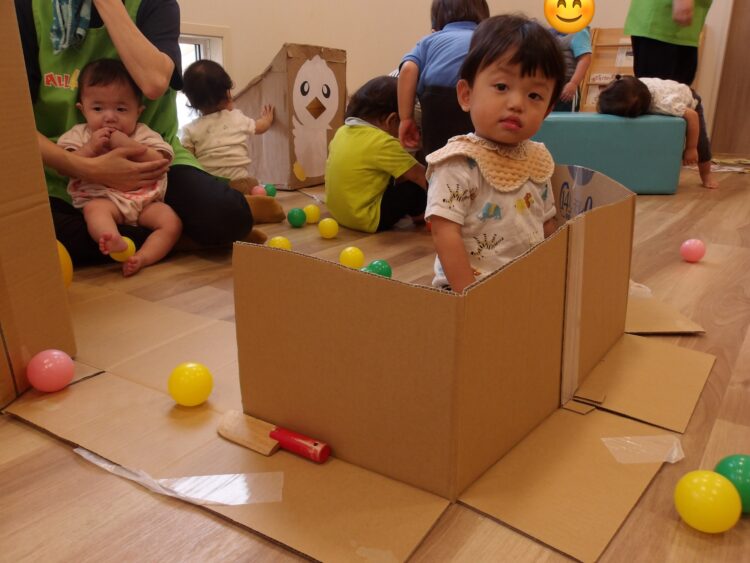 風船でも遊んだよ! ロディやダンボール電車と盛り沢山!やはりボールプールは大人気です! このうさぎさんは何??と不思議そうに見ているね😆