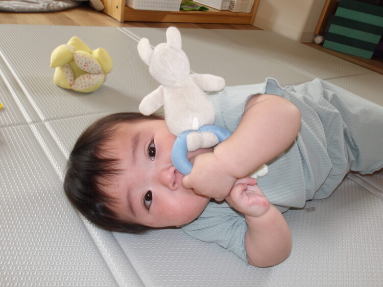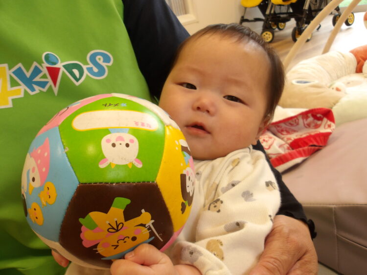 なんだろうと絵本を触っている子もいました ボールを小さな手で触っている子、音の出るオモチャを持って遊んでいました