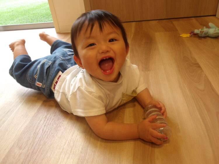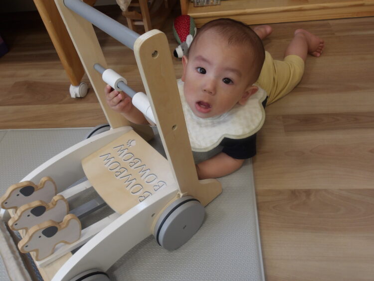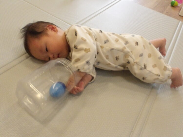 はいはいリレーを楽しんだり、ゴロンと寝返りをして気になる玩具で遊んだりしました。