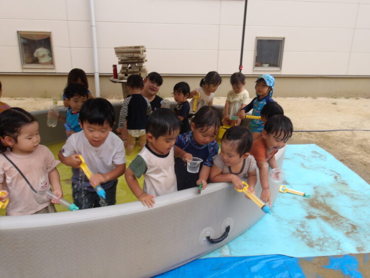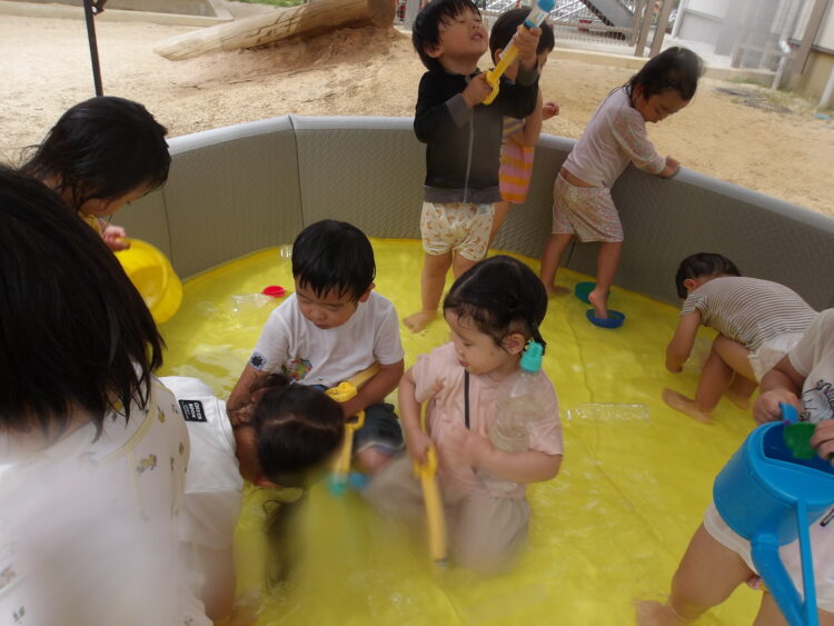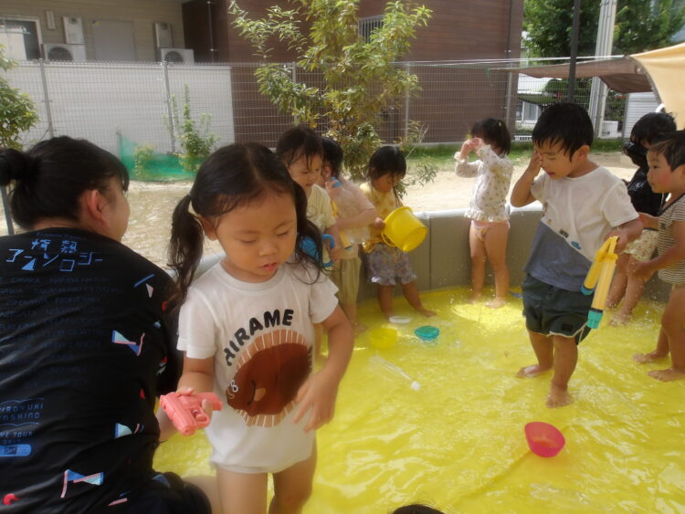 今日はひよこ組、あひる組、うさぎ組の友だちと一緒にプール、水あそびをしました。
