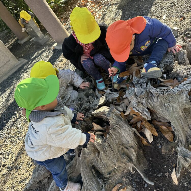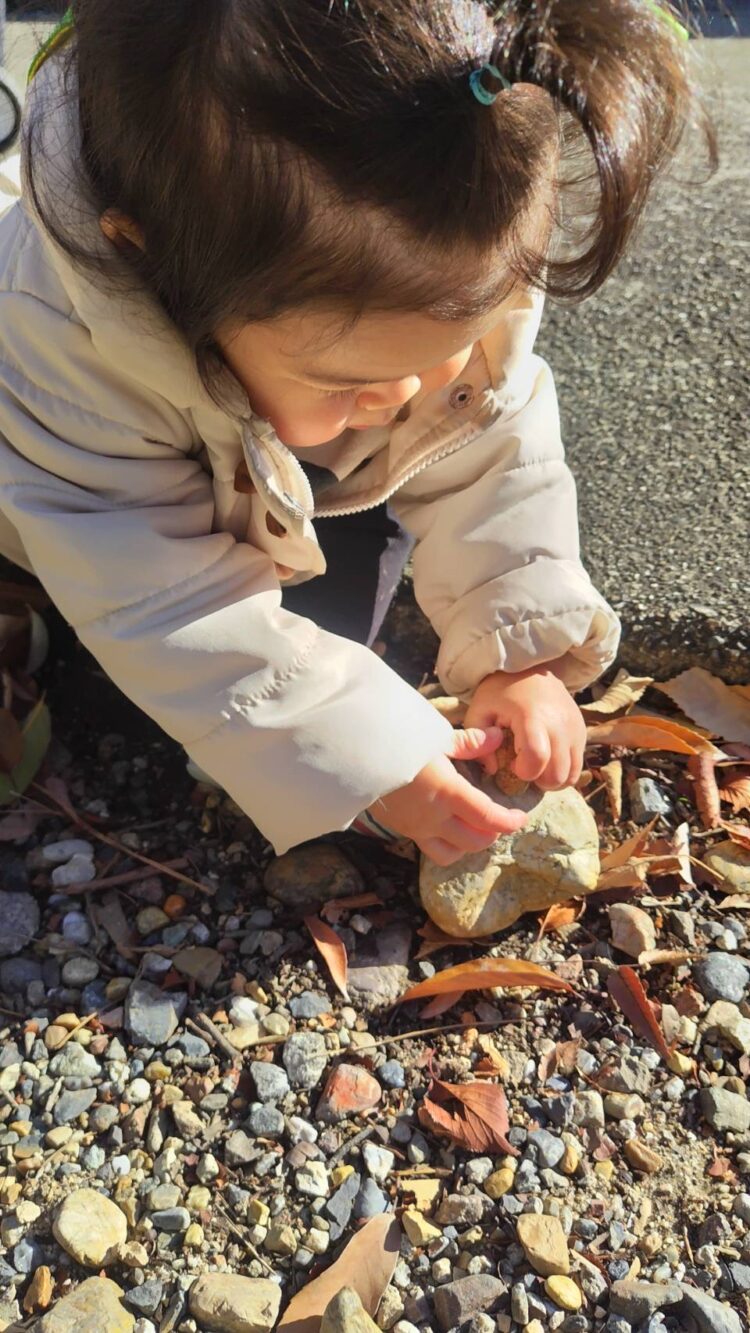 今日は、長い階段を登り喜んでいましたよ 上に着くとさっそく落ち葉を拾っったり上にとばしたりどんぐりを拾ったり、大きな切り株の中に葉っぱやどんぐりを入れてお料理をつくっていました