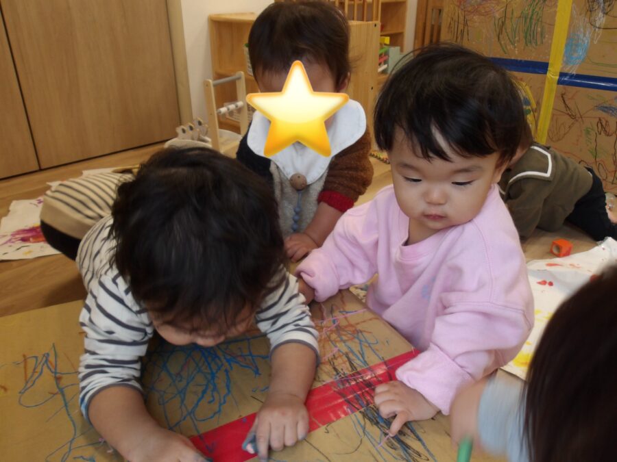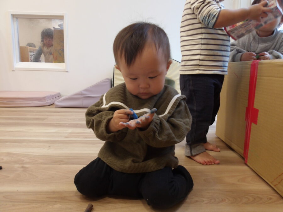 自分の好きな色のクレヨンを選んでいました!トントンと叩いて描いてみたりグーっと長い線を描いたりいろんな描き方をしていました![]()