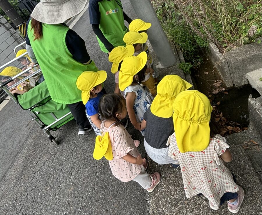 ザリガニ🦞を見つけた保育士の声掛けに、ん?とのぞいて、どこどこ?と興味津々で楽しんで見ていました!