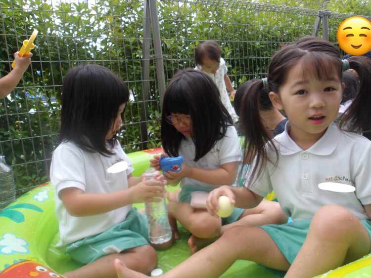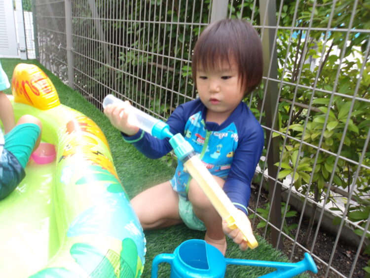 水鉄砲や容器に水を入れてかけ合いっこをしたり、葉っぱに水やりをしてくれる姿が見られました🥰