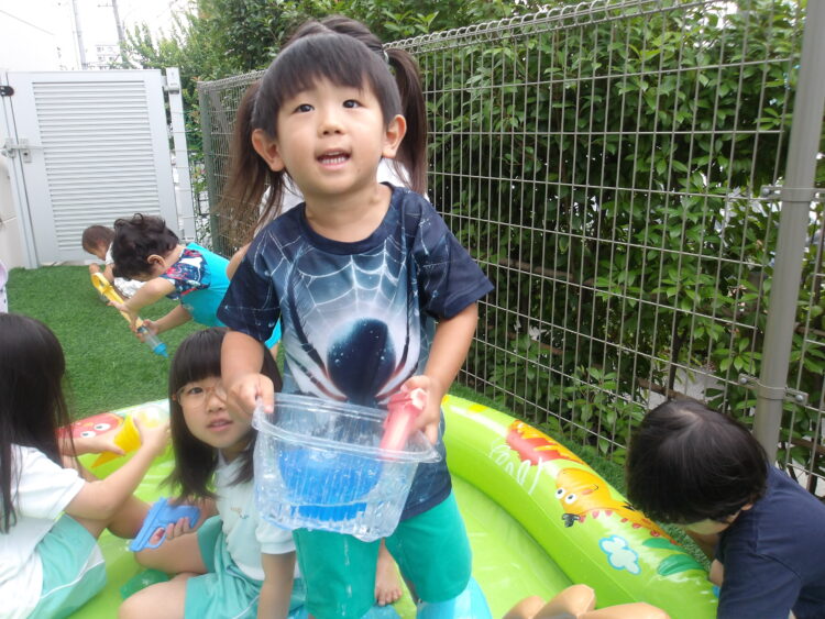 今日はテラスで水遊びとお部屋で風船遊びをしました!
