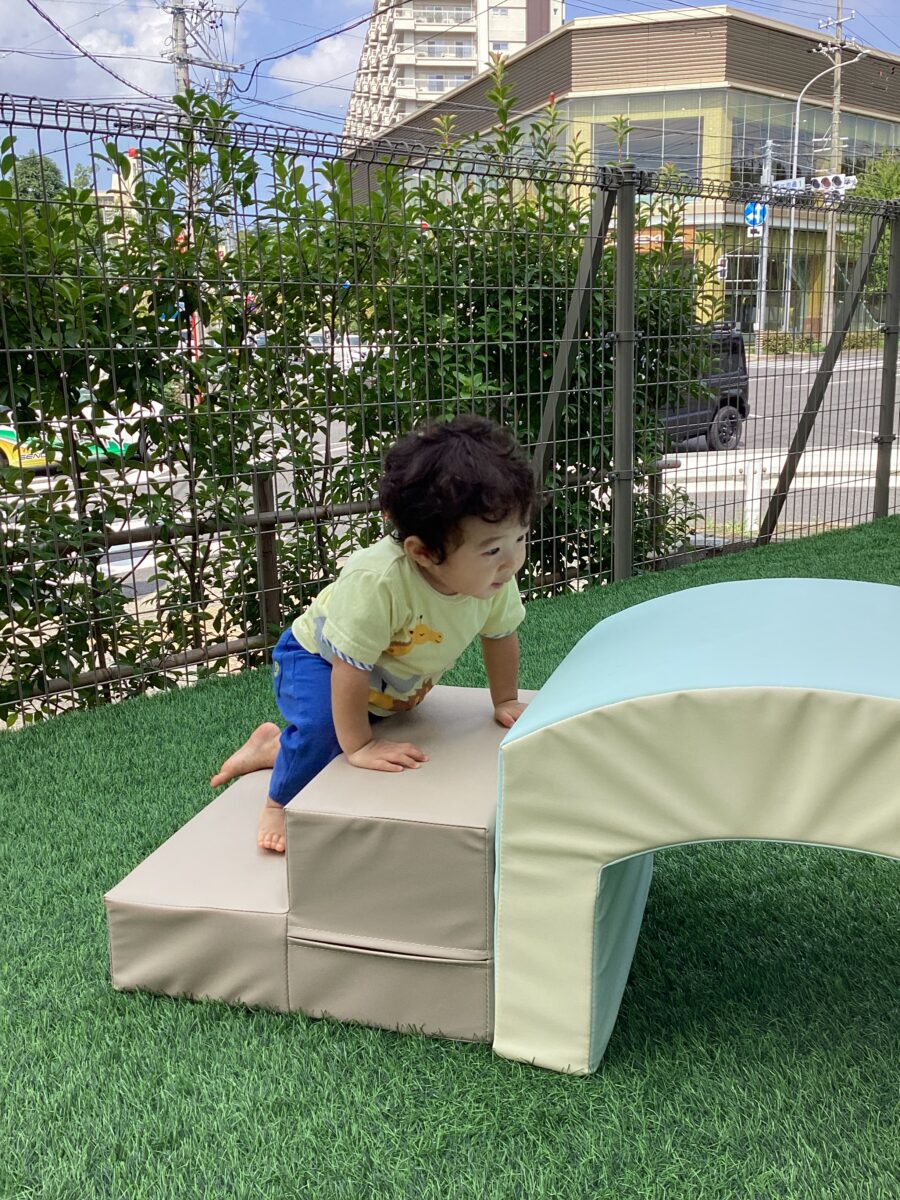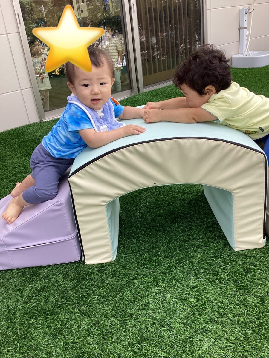 ウレタンマットの滑り台をテラスに出すと、お部屋からすぐにかけてきて、遊び始めたお友だち![]()