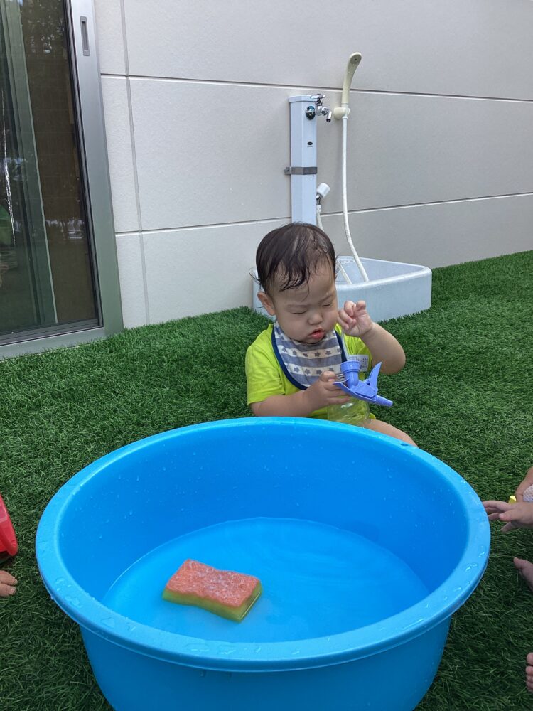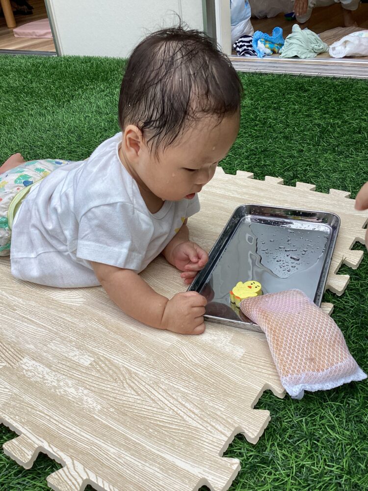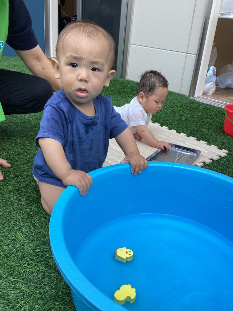 タライの中に入っている水を見て手で水を触っていました  ひよこを持っているね これはなんだろうと見ているのかなお水冷たかったかな