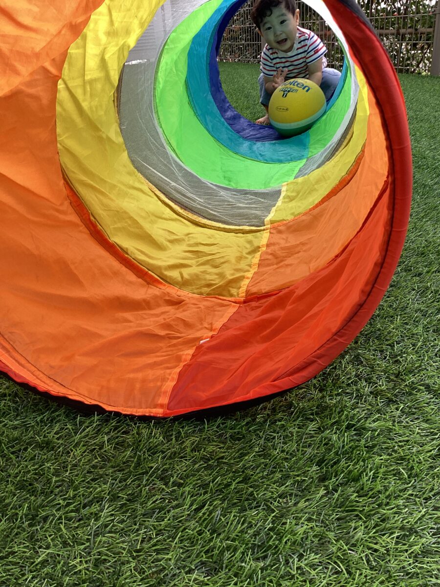元気いっぱいのひよこ組さんは、テラスで、トンネルで遊びました