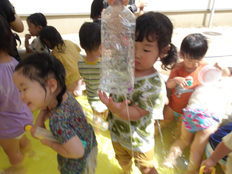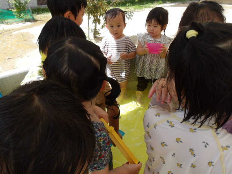 水鉄砲で壁に水をかけたり、お皿に入れたり出したりして遊んでいました💧