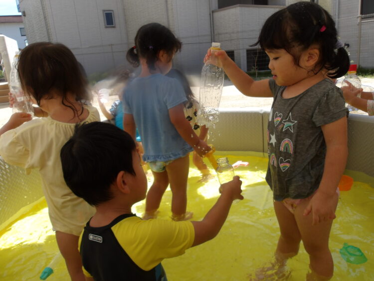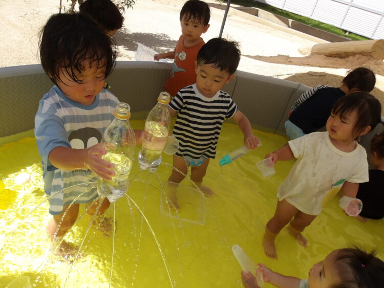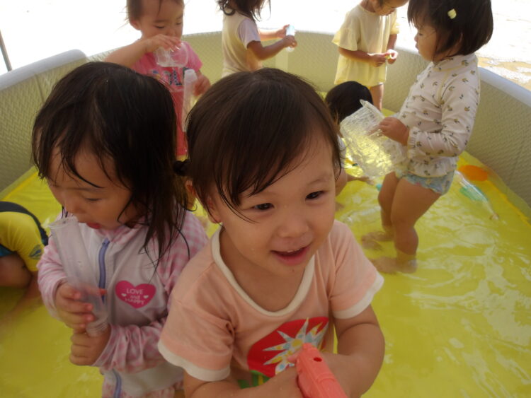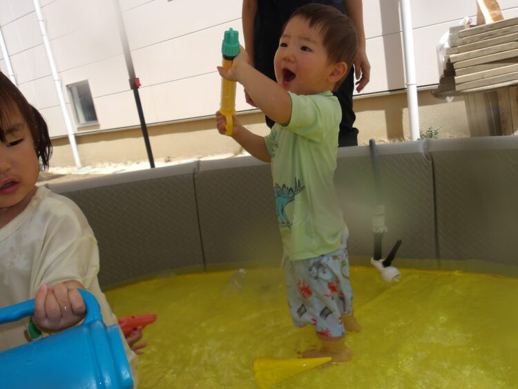 水鉄砲や器に水を入れて小窓にかけたり、いろいろな場所にかけて楽しく遊ぶ姿が見られました!