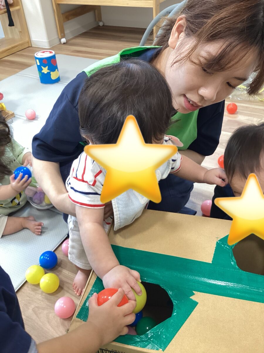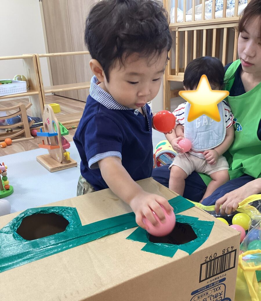 穴が空いた段ボールにボールをポットンと落として遊びました!