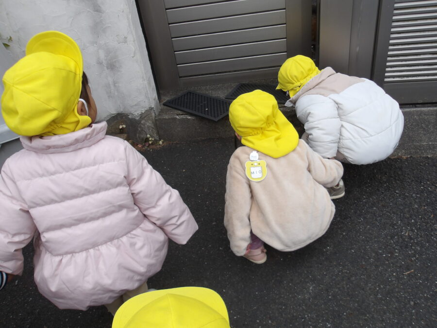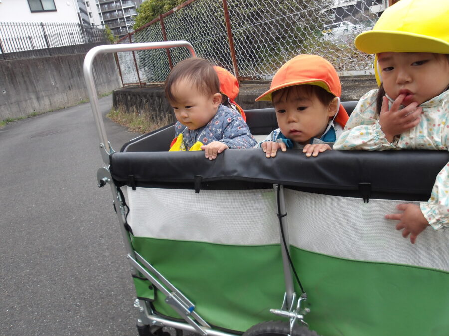 園庭で遊んだ後は、お散歩に行きましたよ!遠くからわんちゃんの声が聞こえると、「わんちゃんだー」と言って嬉しそうに見に行きましたよ♪みんな興味津々で見ていましたよ![]()