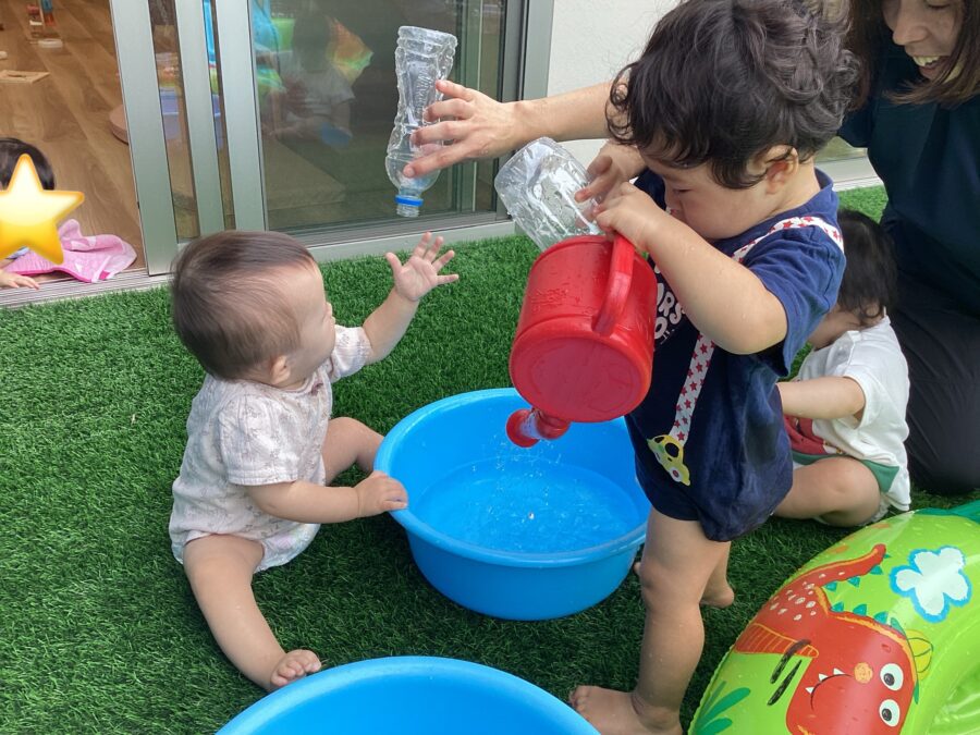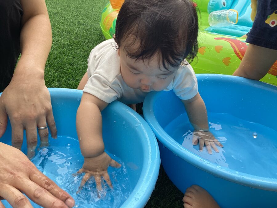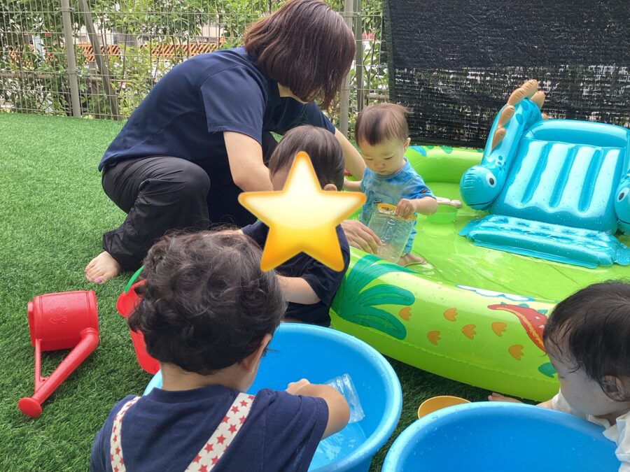 お盆休み明け、元気いっぱいに登園してきてくれたひよこさん久しぶりにプール遊びをしましたよお水を入れて!と保育士にお願いしにきたり、自分で移動してお水を触りに行ったり。。。 タライの水をバシャバシャ両手で触っていましたよ 水遊びも残り少しになりました残り数回楽しもうね
