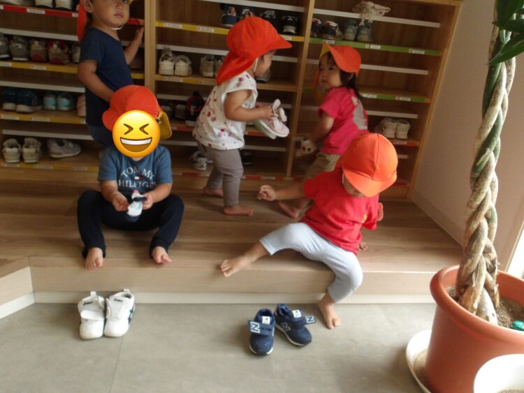 1人、2人の子が始めると、僕も!私も!といったように、靴や靴下を履いたりする子ども達なのでした♪