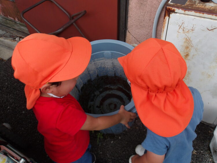 溜まった雨水を何かいるかなー?と見つめる子がいました!