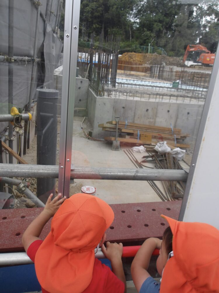 いつも園から見える工事中🏗️のクレーン車を目の前で見ることができ最初の子が立ち止まれば皆、あーっと指をさして、張り付いたようにクレーン車に見入っていましたよ♬👀