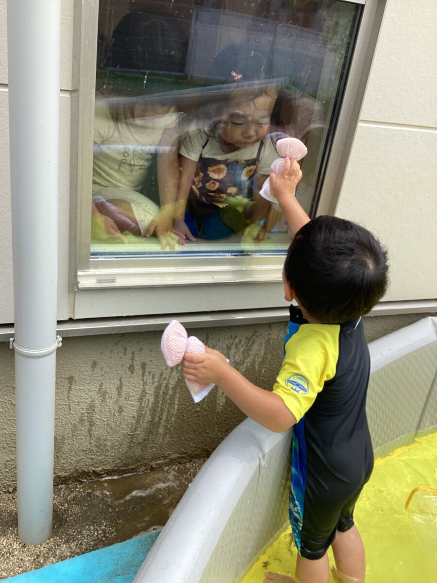 今日はお部屋で遊んでいるお友達にも、窓越しからお魚のスポンジでゴシゴシと擦って、コミュニケーションを取ってお部屋にいるお友達にも楽しませてあげていて、カッコいいです![]()
