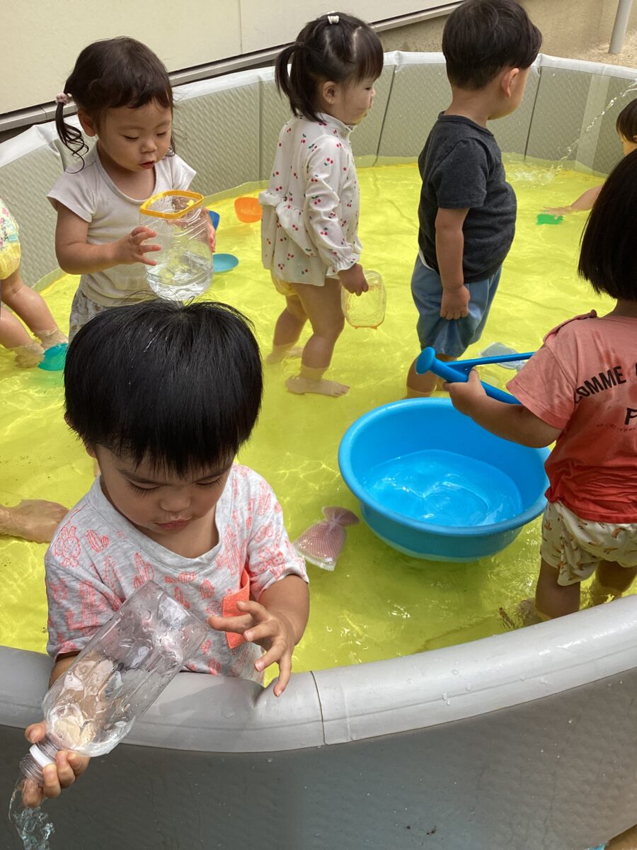 それぞれ、タライやペットボトル、ジョウロにお水を入れては出してを繰り返して、遊んでいました![]()