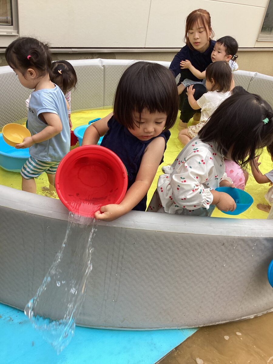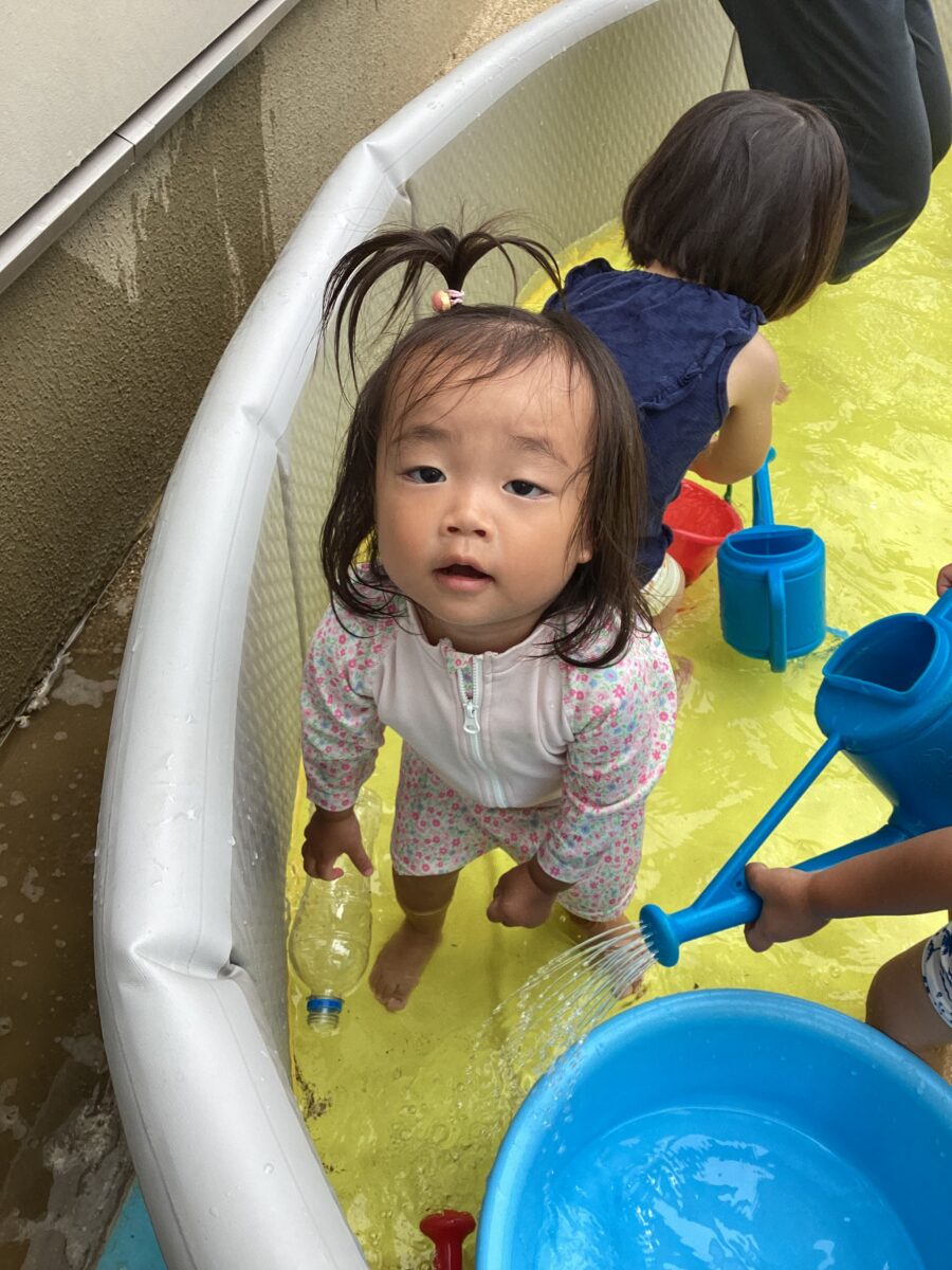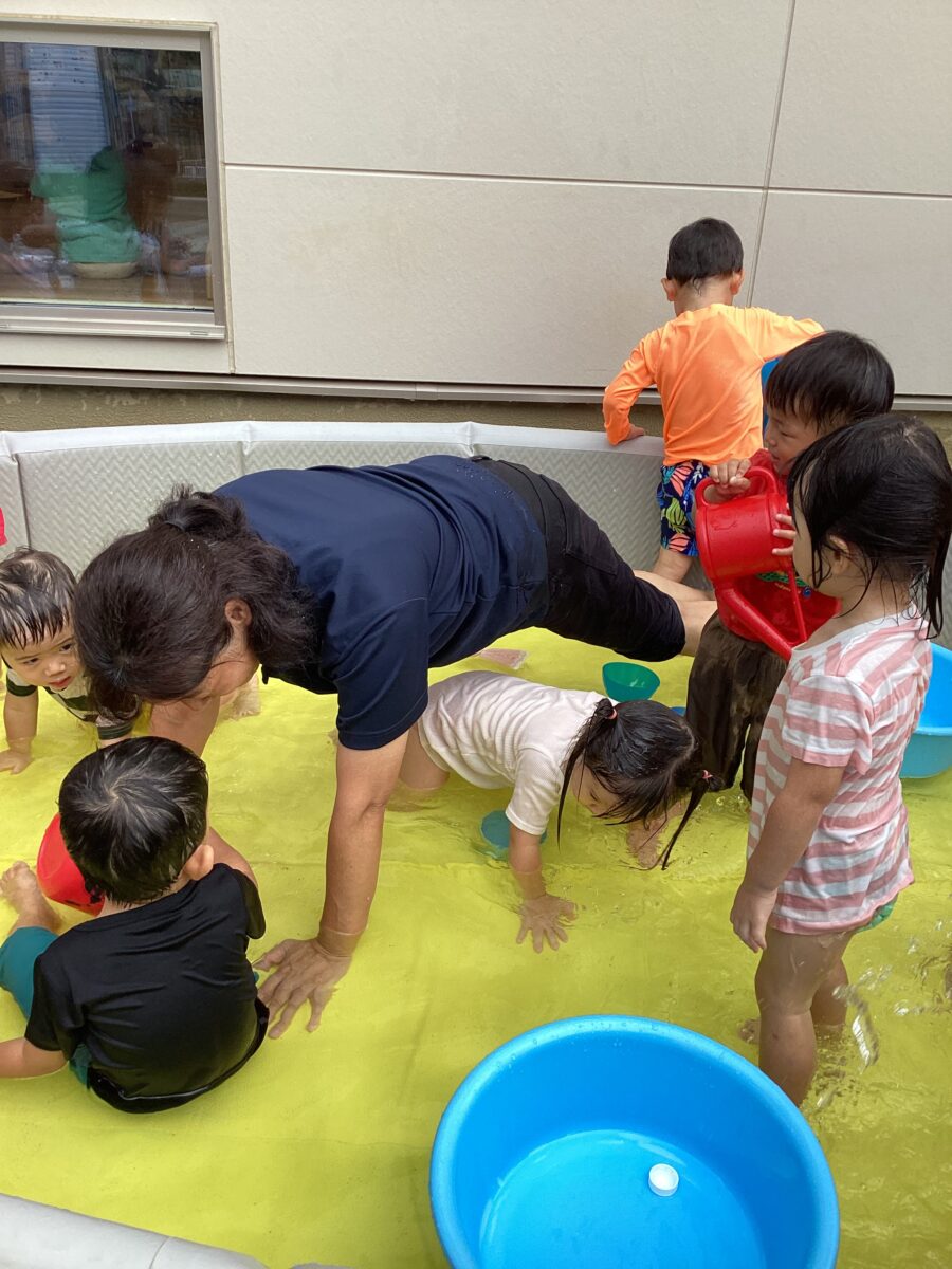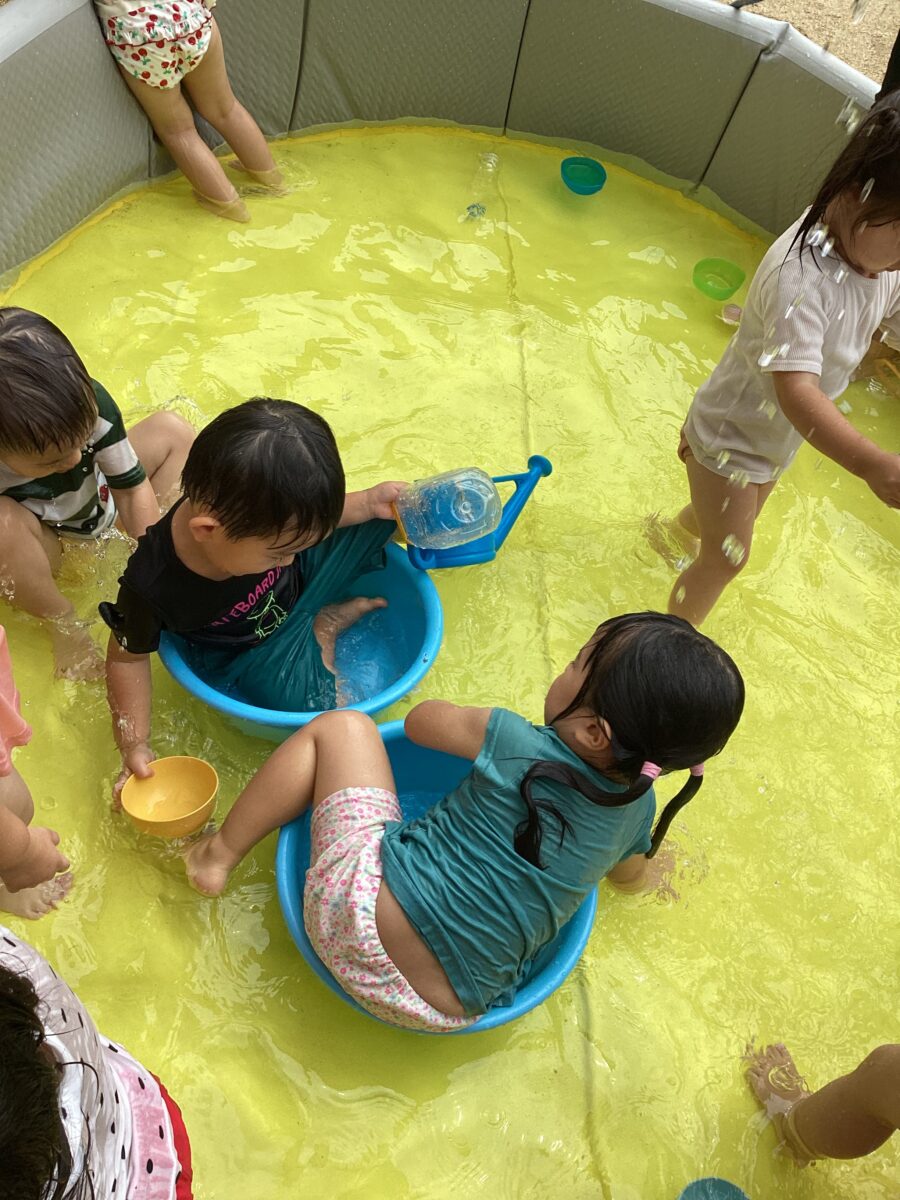 久しぶりでお水が怖い子は、保育士やお友達の力を借りて、お水をかけてもらったり、少しずつお水に触れながらお水遊びを楽しんでいましたよ〜