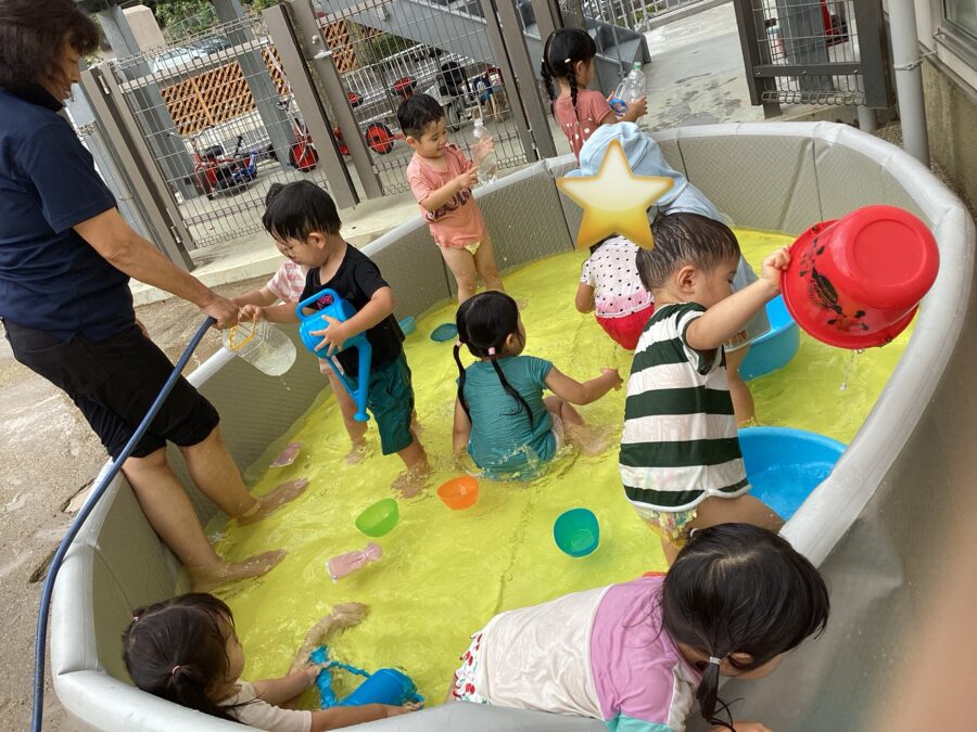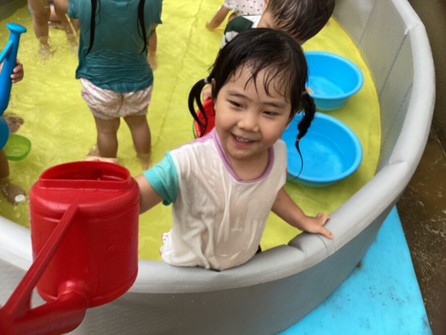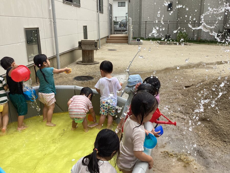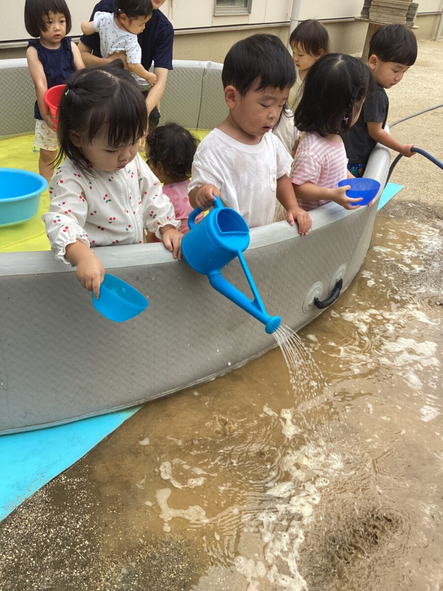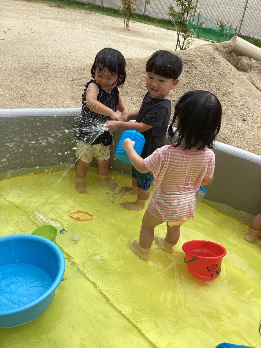 久しぶりでお水が怖い子は、保育士やお友達の力を借りて、お水をかけてもらったり、少しずつお水に触れながらお水遊びを楽しんでいましたよ〜