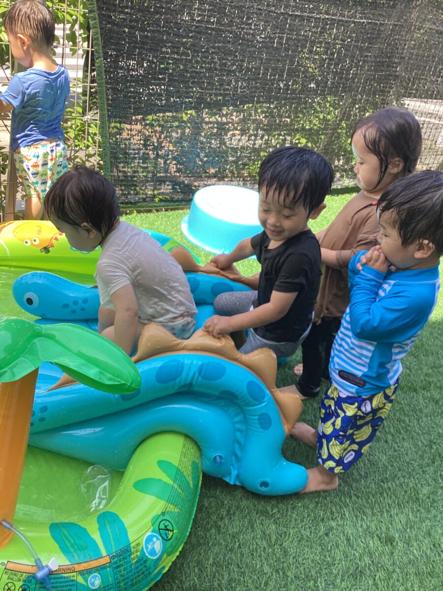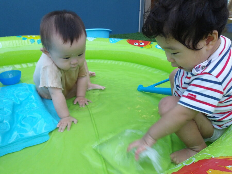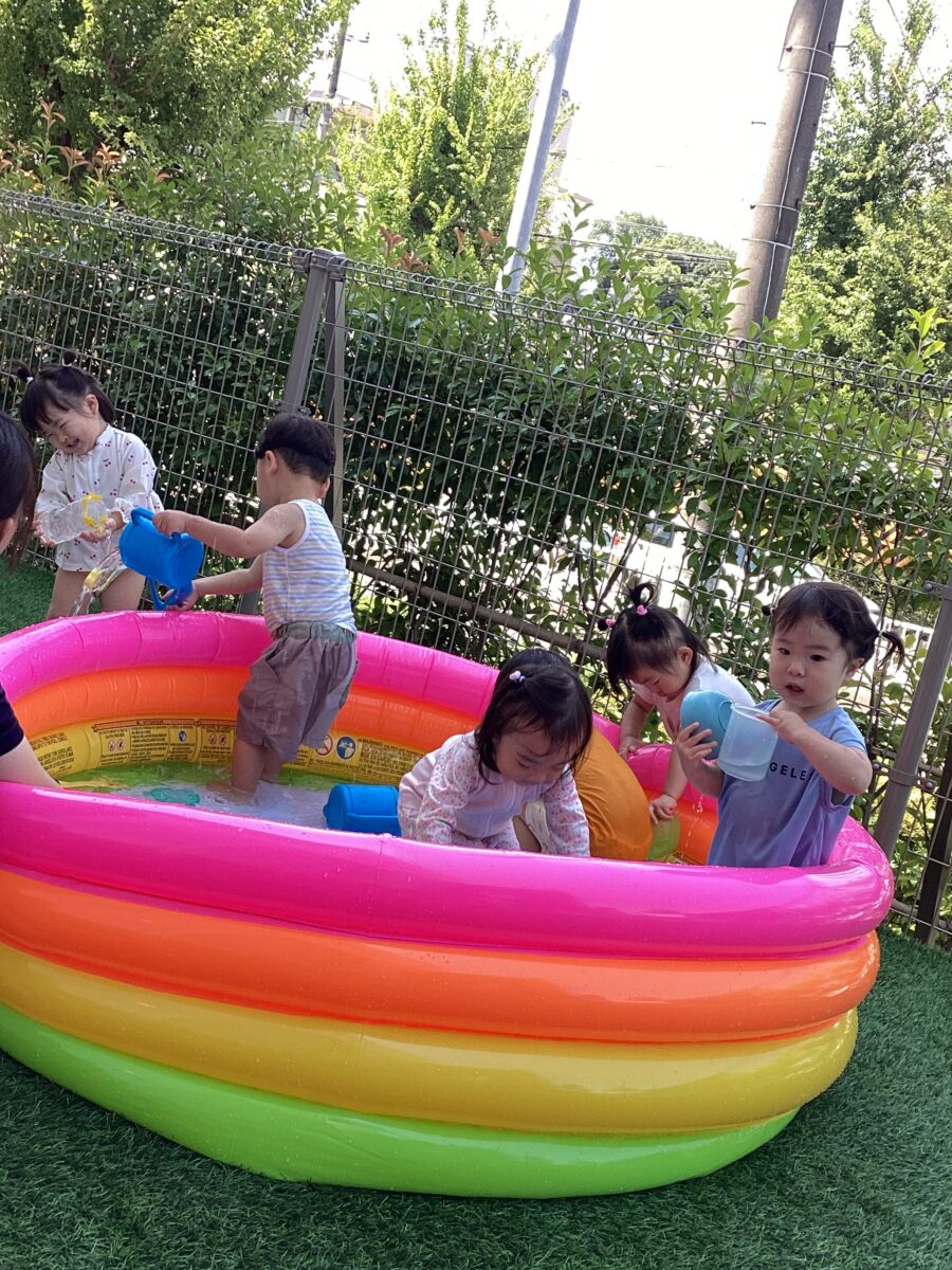 今日はテラスでプール遊びをしましたよ!
