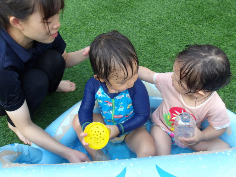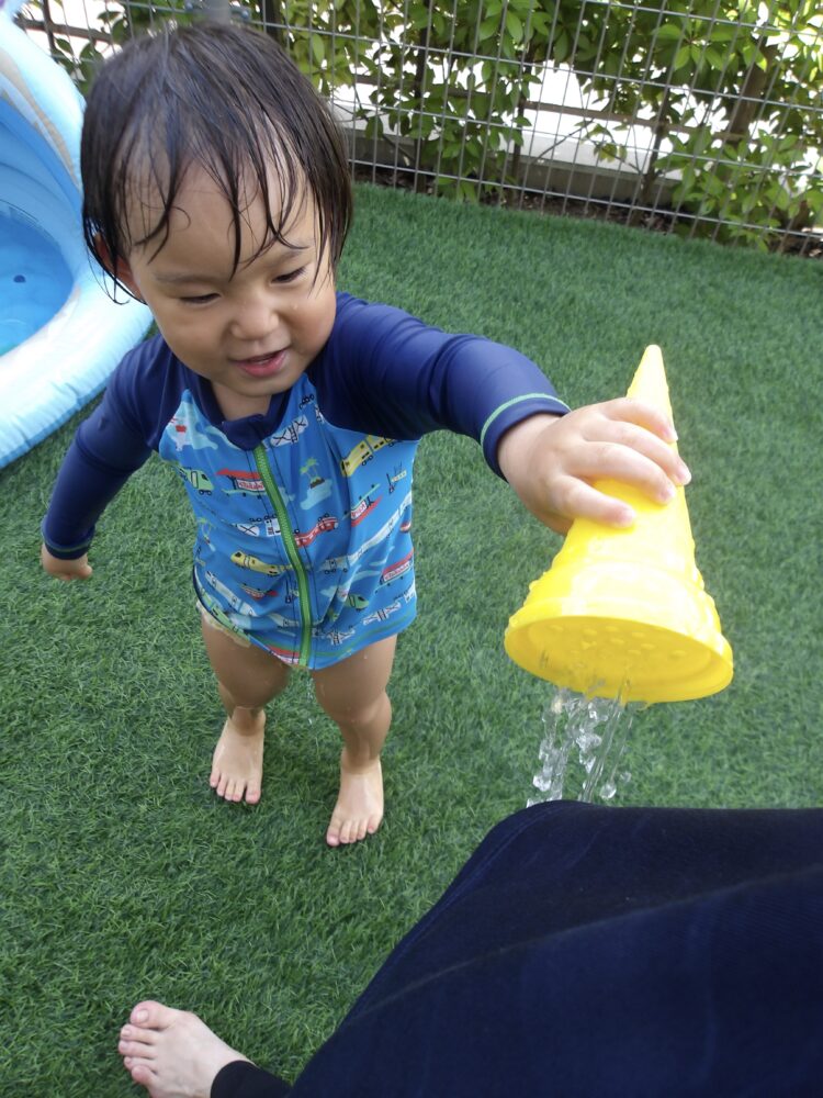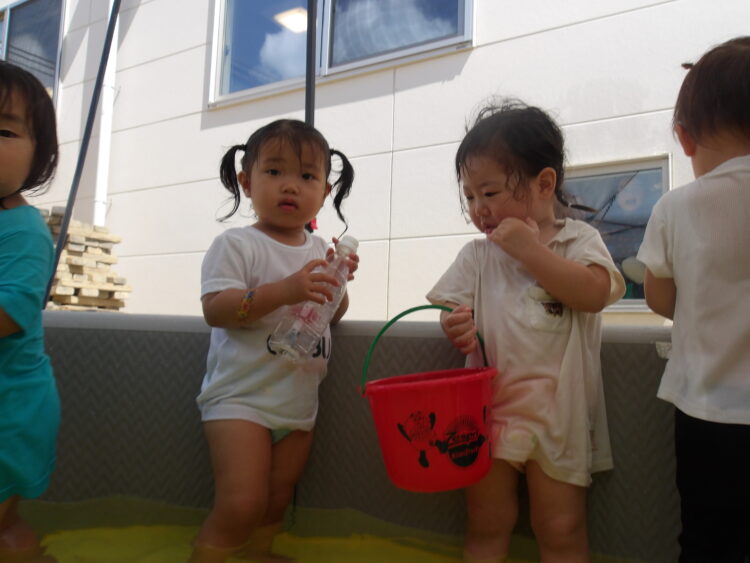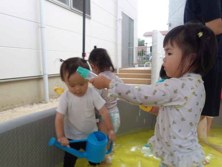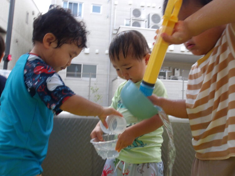 お友だちのバケツやカップなどの入れ物に水を入れてあげる姿が😁
