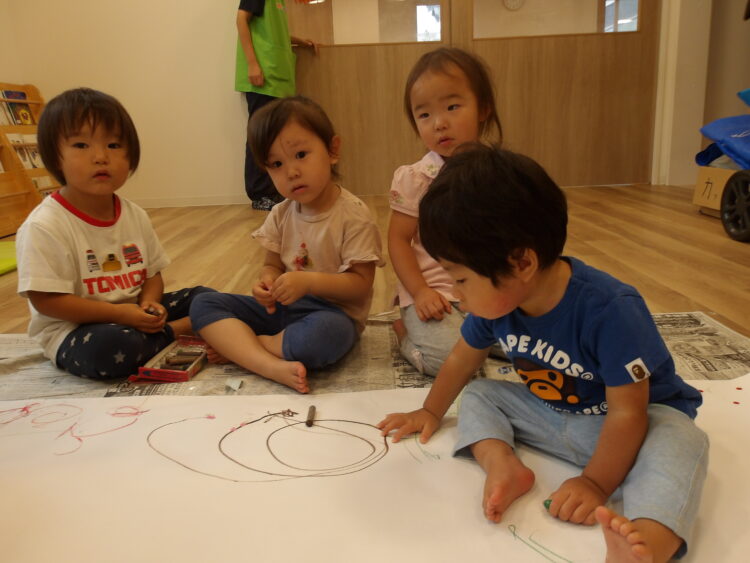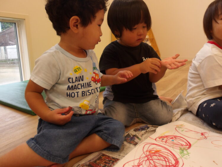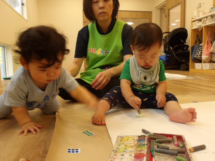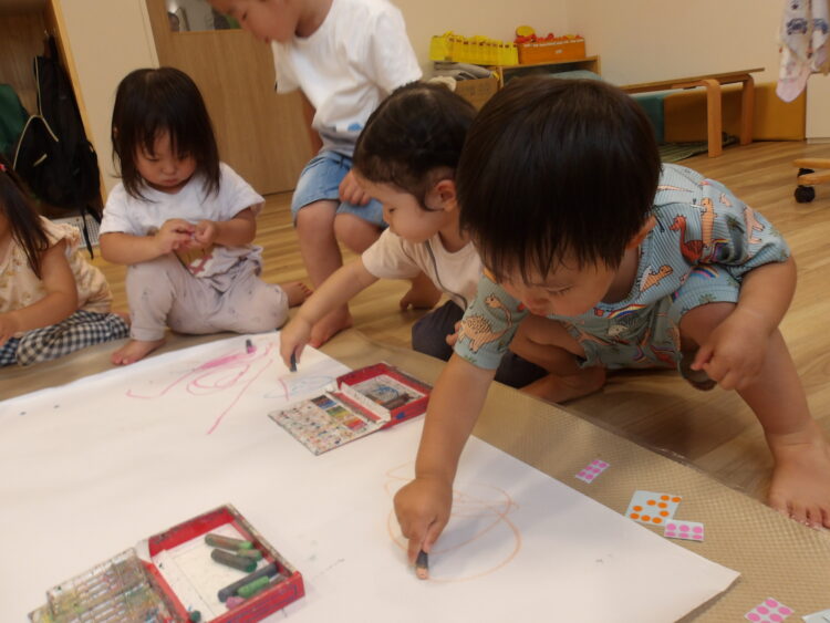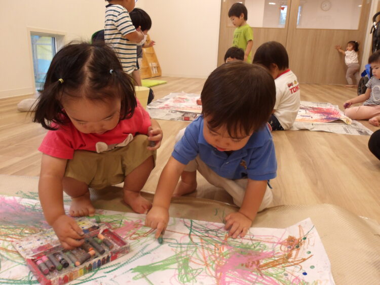 何色にしようか、選びながら好きな色のクレヨンを持って思い切り手を動かして描いていましたよ😆