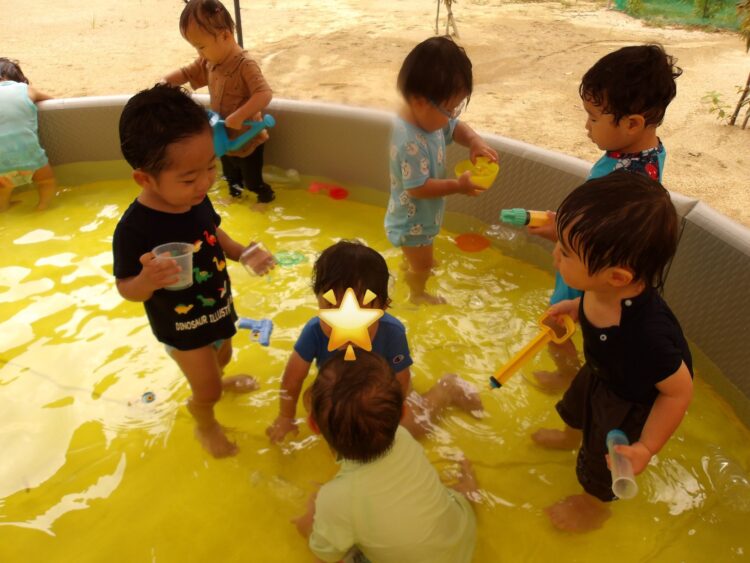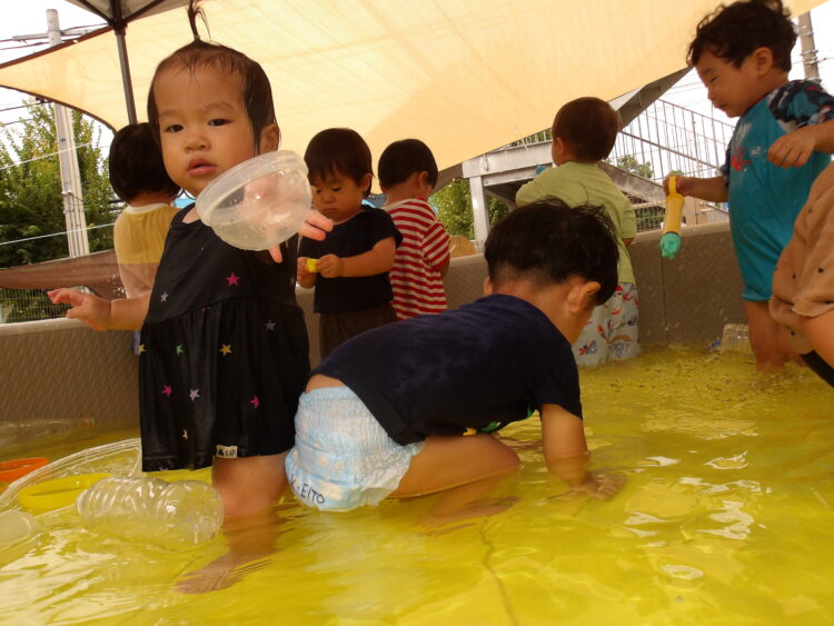 あひる組さんはプール遊び。水鉄砲や容器でたくさん遊ぶよ!