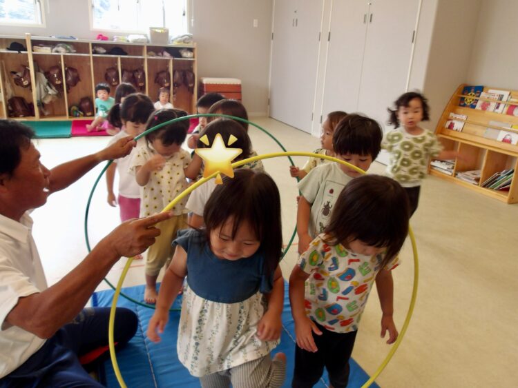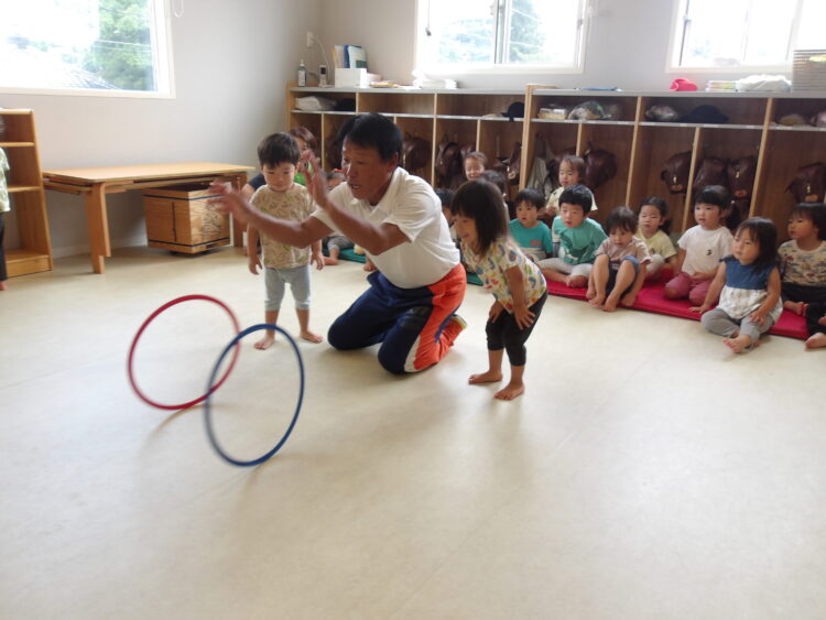 うさぎ組は体操教室でした。大きな輪を立ってくぐり、