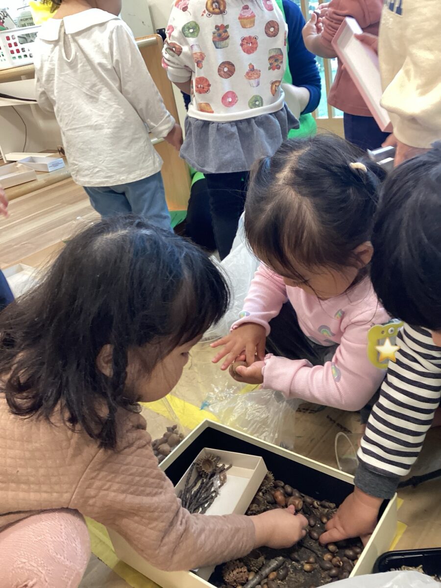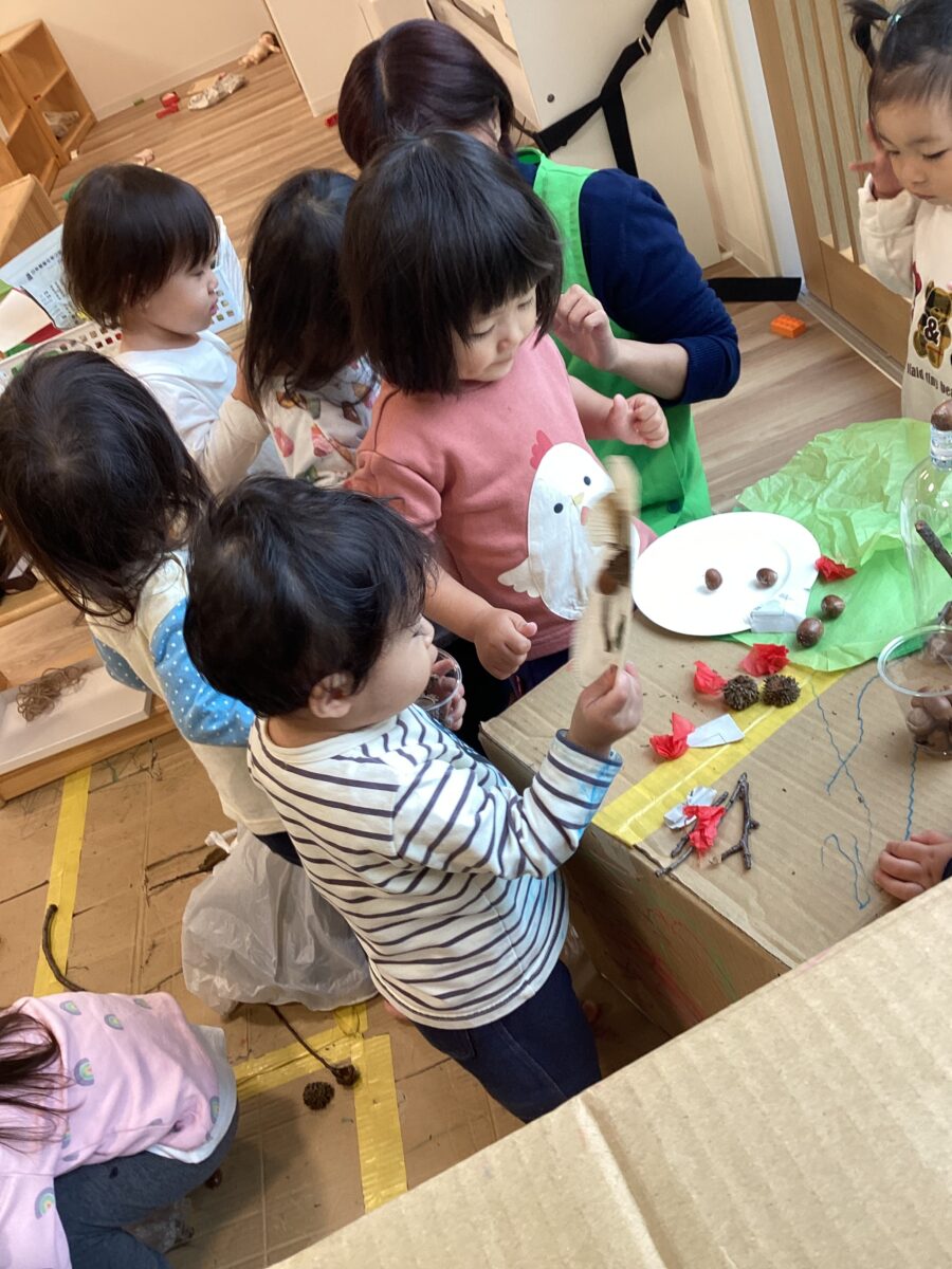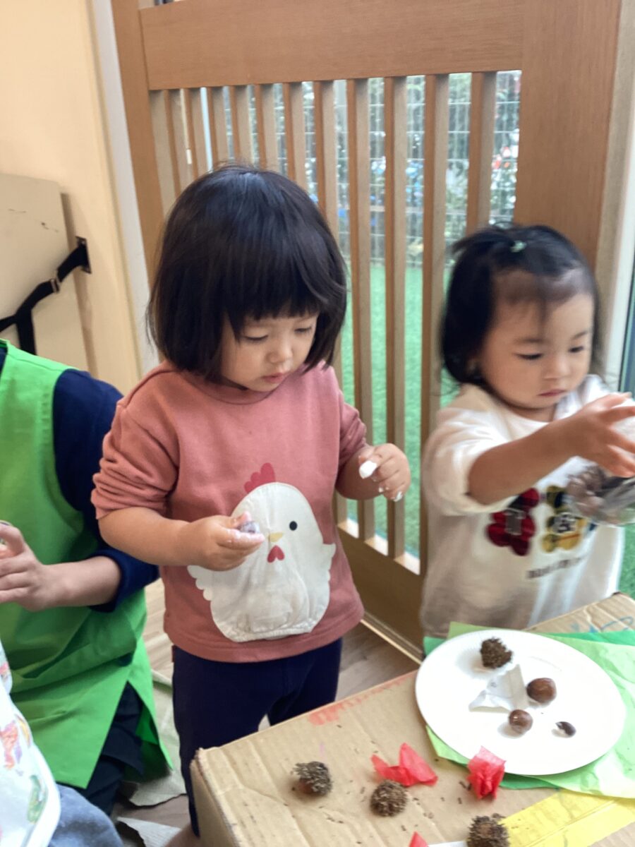 クレヨンでお絵描きをしたり、木の実を貼ったりしました!