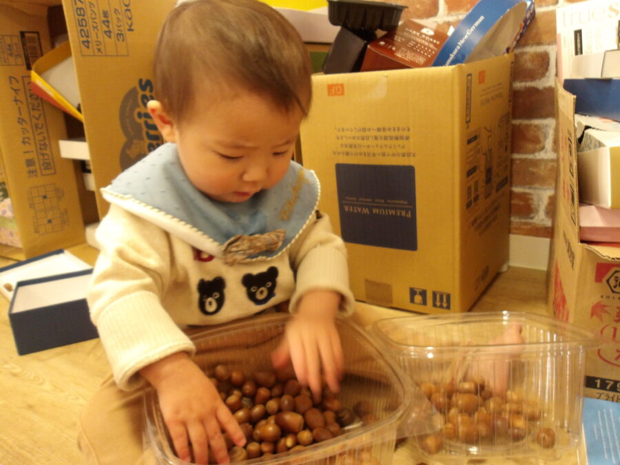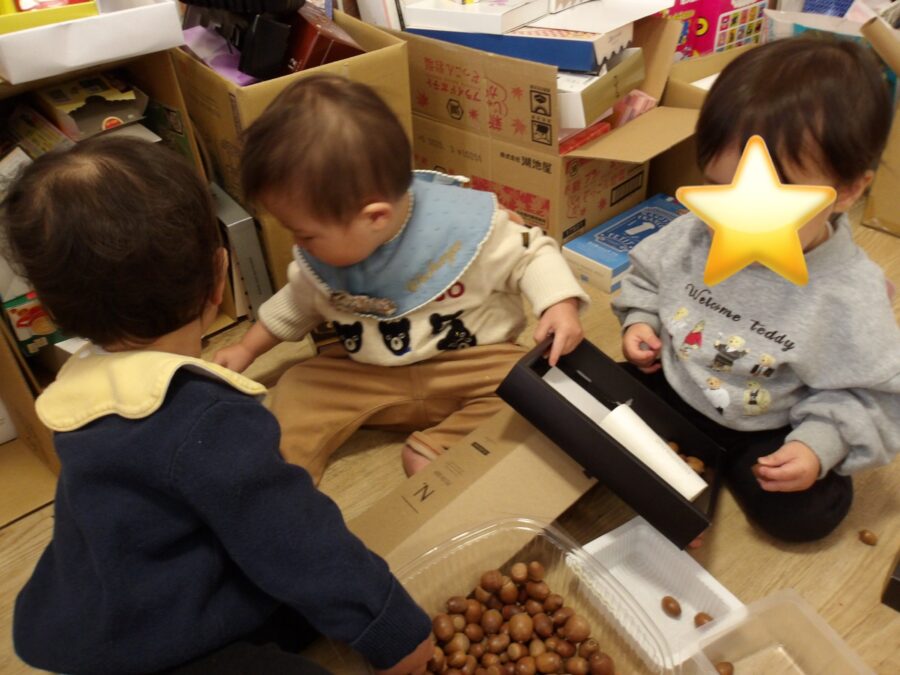 工作のお部屋には箱やどんぐりトイレットペーパーの芯など魅力的なものがいっぱいでここには何があるのかな〜、これは何かな〜といろんなものを出したり触ったりして遊びました![]()